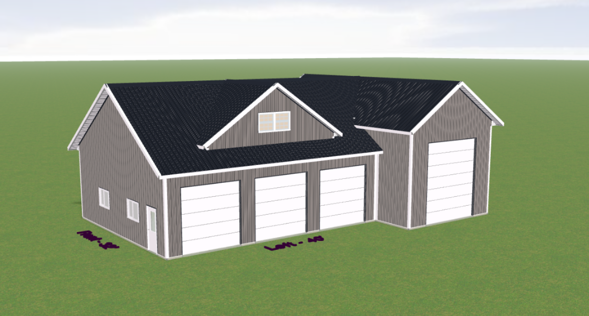 can you make this look more realistic as if taken by a camera add some rural trees in the background and make the yard look nice add concrete in front of the overhead doors