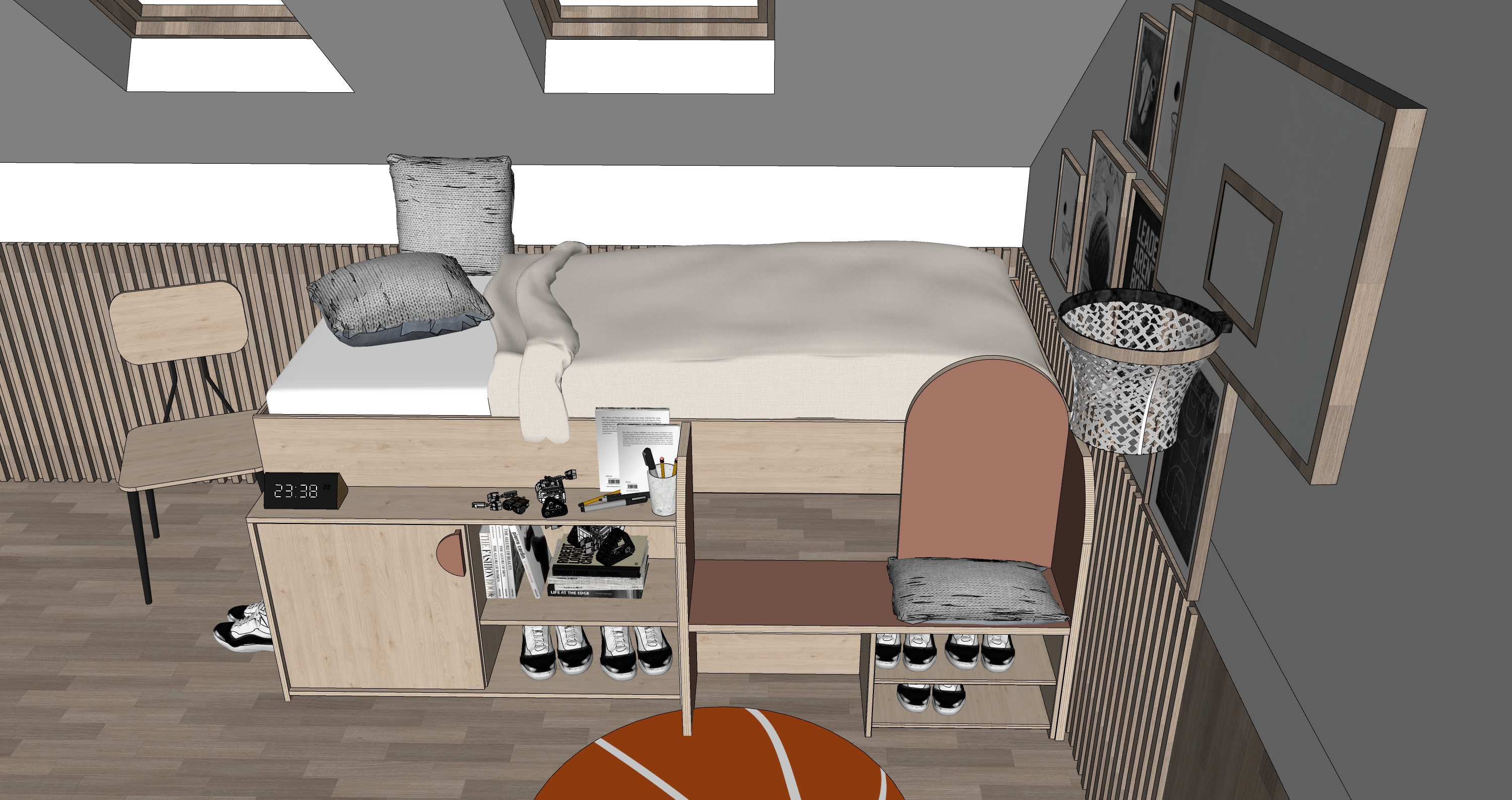 chambre enfant avec 2 lit bois clair et terracota satin sur le th me du basquette ball moderne et minimaliste ambiance chaleureuse et naturelle peu de contraste entre ombre et lumi re sol en parquet clair motif chevrons type terrain de basket mur du fond d cor de panneaux verticaux en bois clair la partie haute et plafond sont blanc et le bas des murs sont avec des lattes bois deux velux ouvert au plafond diffuse de la lumi re chaude style scandinave japandi palette de couleurs neutres beige bois clair terracotta une bande led tout le long de la d marcation bois des murs literie avec drap et couettes r aliste coussin poss dant une texture laine boucl textur tableau en arri re plans rendre plus r aliste avec des effets de vitre ballon de basket orange et noir photographie ultra r aliste textures tr s d taill es clairage naturel cin matographique ajoute profondeur de champ r aliste quilibre parfait des couleurs qualit 4k ultra hd rendu architectural professionnel