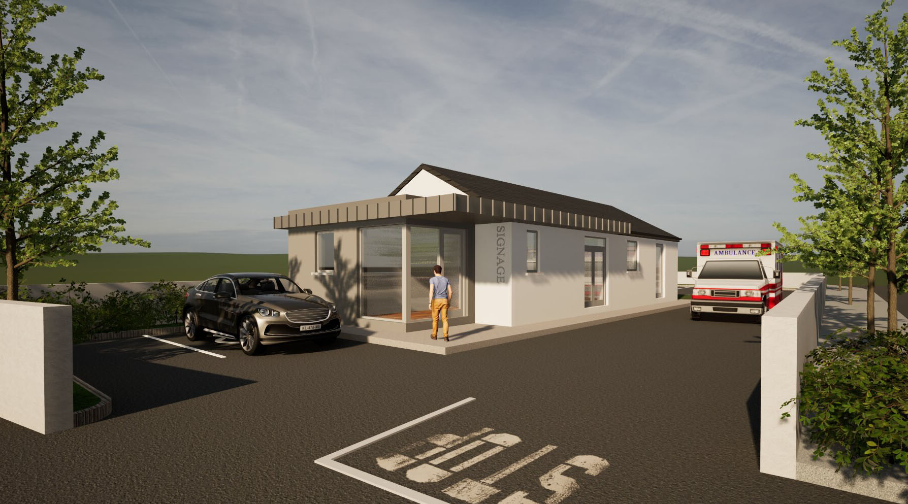 a modern minimalistic medical facility with a sleek contemporary design the building features a clean white facade with large glass windows reflecting a clear blue sky the roof is a contrasting dark grey with muted silver trim in the foreground a polished gray luxury car is parked on the smooth charcoal asphalt next to an emergency ambulance in classic red and white the atmosphere is calm and professional with lush green trees and neatly trimmed bushes lining the scene casting gentle shadows on the pavement the lighting is natural and serene suggesting a bright sunny day