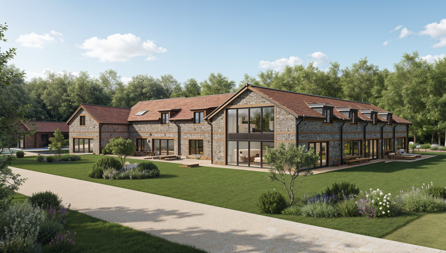 generate a hyper realitic visual of my architects design this is a arn conversion into a number of houses the roof is red riles and the walls are grey flint with red brickwork detailing add classy planting to the gardens with a black post and wire fence and also the track in the foreground is a light gravel add trees and sky behind building dont change proportions or view of the building and make the roof look new