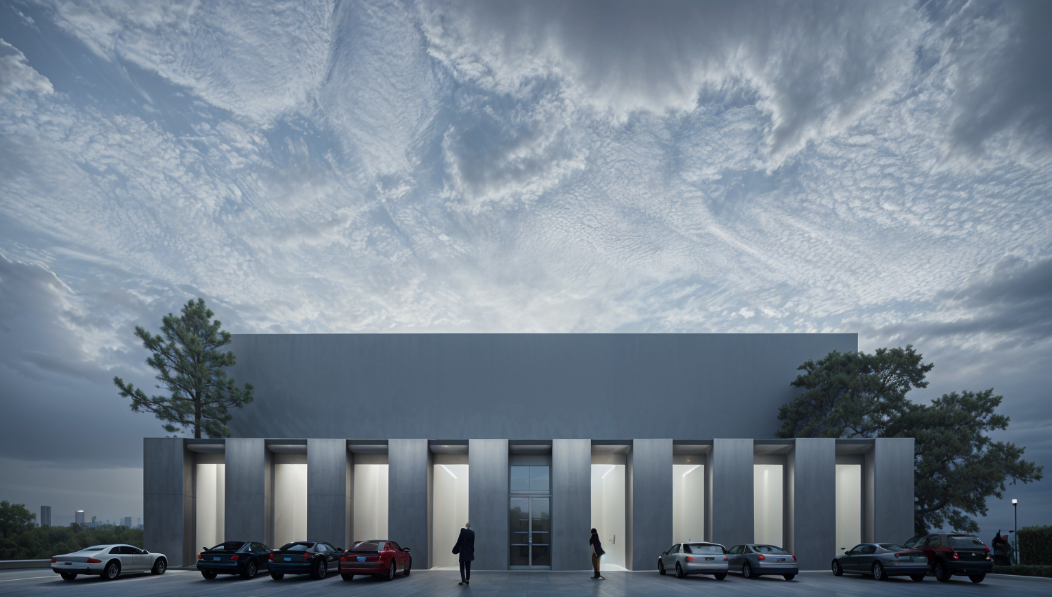 minimalism exterior shot day time day time atmosphere with rain access area from the middle with interior radiating lighting futuristic illuminated parking overall scene together with the building is quite bright romantic clouds architecture