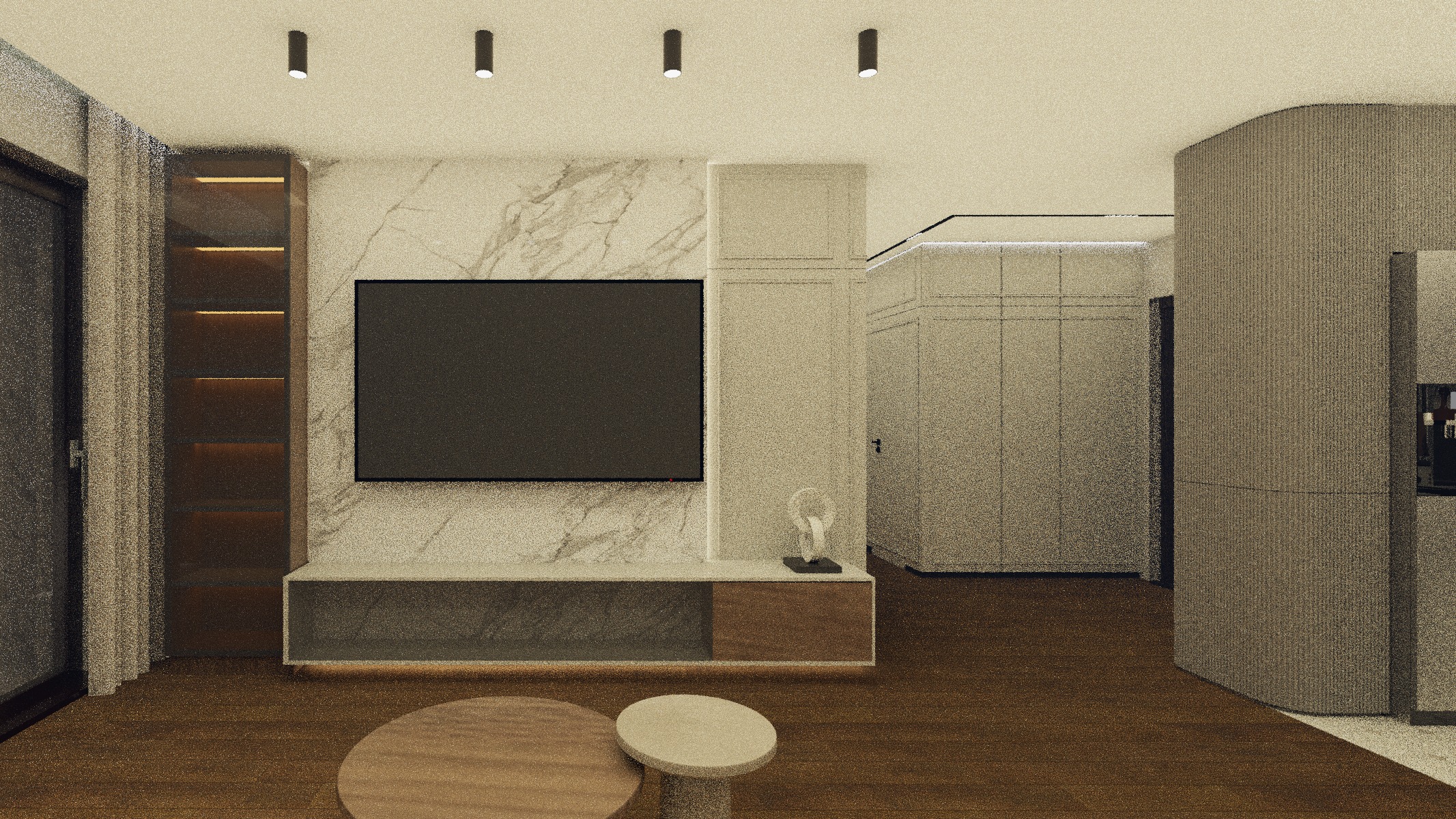 create a photorealistic interior rendering of modern living room preserving exactly the existing camera position framing perspective geometry scale proportions materials textures colors and functions of all architectural and furniture elements do not move resize redesign remove or replace any walls niches panels ceiling surfaces or floor elements only improve rendering quality texture realism and lighting atmosphere render a sophisticated modern living room with warm lighting the walls feature elegant gray paneling complemented by a smooth white marble accent wall with subtle gray veining a sleek black flat screen tv is mounted centrally above a minimalist console with glass and wooden elements like in a picture now a pair of nesting tables in contrasting light beige and brown sits on the wooden floor enhancing the cozy atmosphere floor to ceiling curtains in a soft beige frame large glass doors creating an inviting airy feel add ambient lighting with black ceiling spotlights casting a gentle warm glow throughout the room lighting enhancements concealed warm led strip lighting 2700k leds must remain invisible 2700k strictly atmosphere warm elegant mood with soft indirect lighting gentle highlights on wall panels and highly realistic materials add reflections to all glass surfaces terace door shelf and console doors put some books inside shelf cabinet outside is urban surrounding with some trees