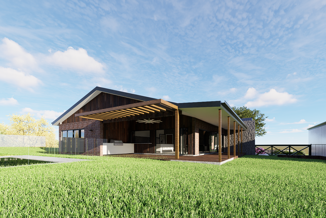 modern house with a minimalist design set in a lush green landscape the exterior features natural wood and dark brick textures complemented by sleek glass windows render the sky in a soft blue with fluffy white clouds and create a warm sunny atmosphere with soft shadows cast by the pergola use vibrant green for the grass and subtle yellow hues for the sunlit areas the overall mood should be tranquil and inviting with a focus on the harmony between nature and architecture