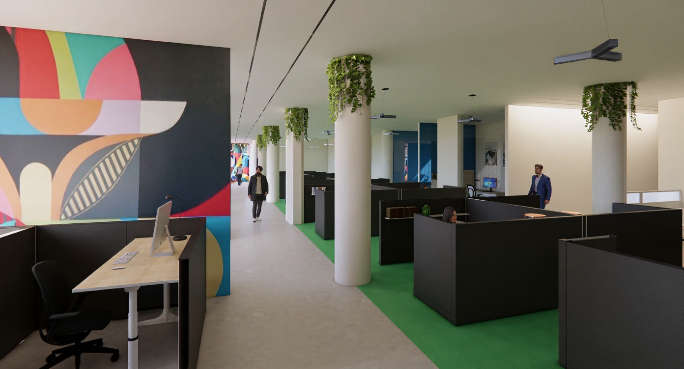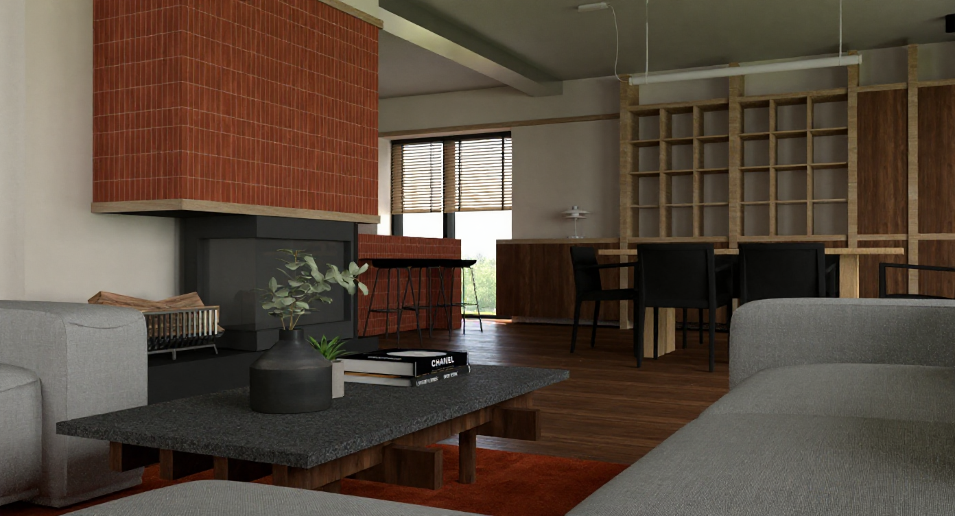 turn this into a photorealistic render and add white metal panels to the ceiling that are suspended 1 0 then add industrial pendant lights that come through those panels and a large black industrial light that will hang over the kitchen island