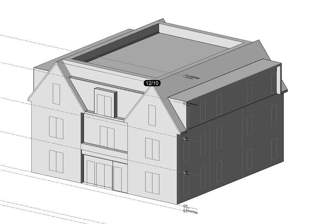make all white claboard make the front left windows bump out on 1st and 2 floor and dark grey panel around these windows make top floor nautral grey brown wide plank vertical wood