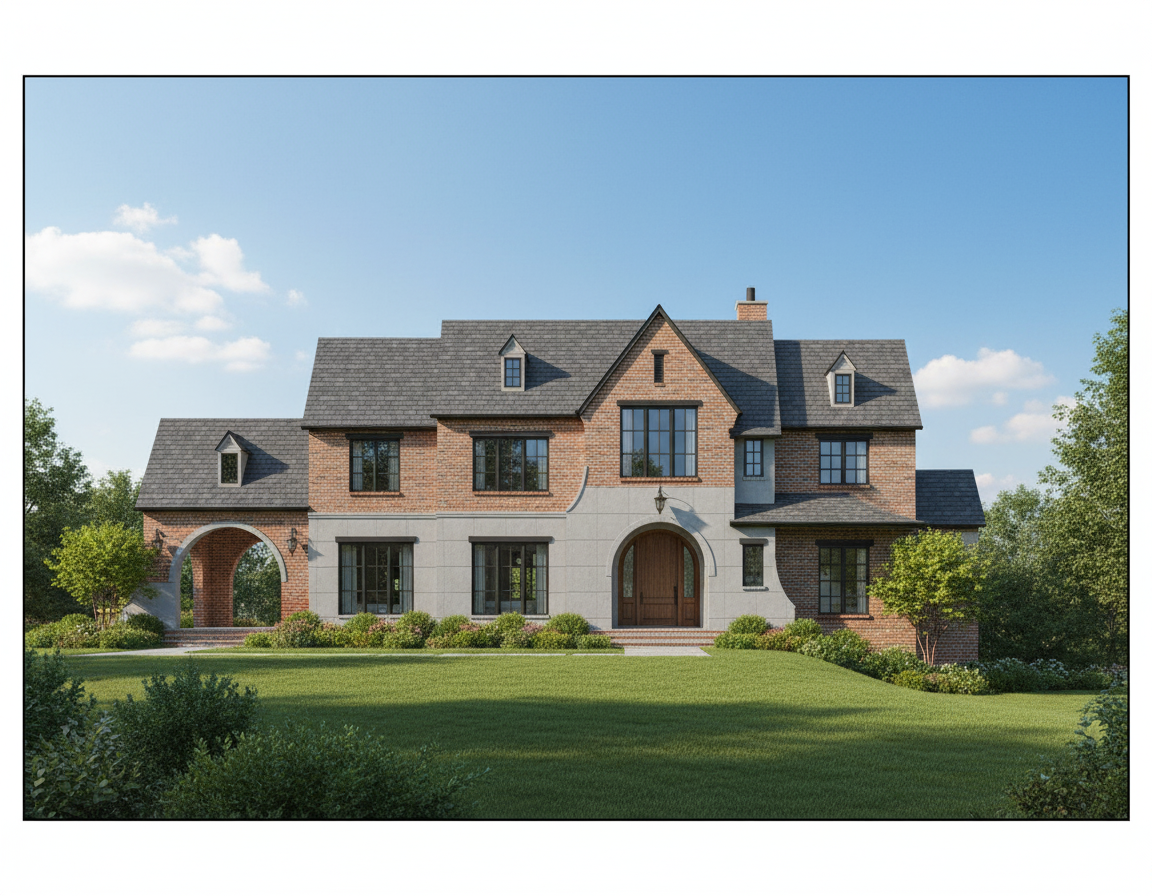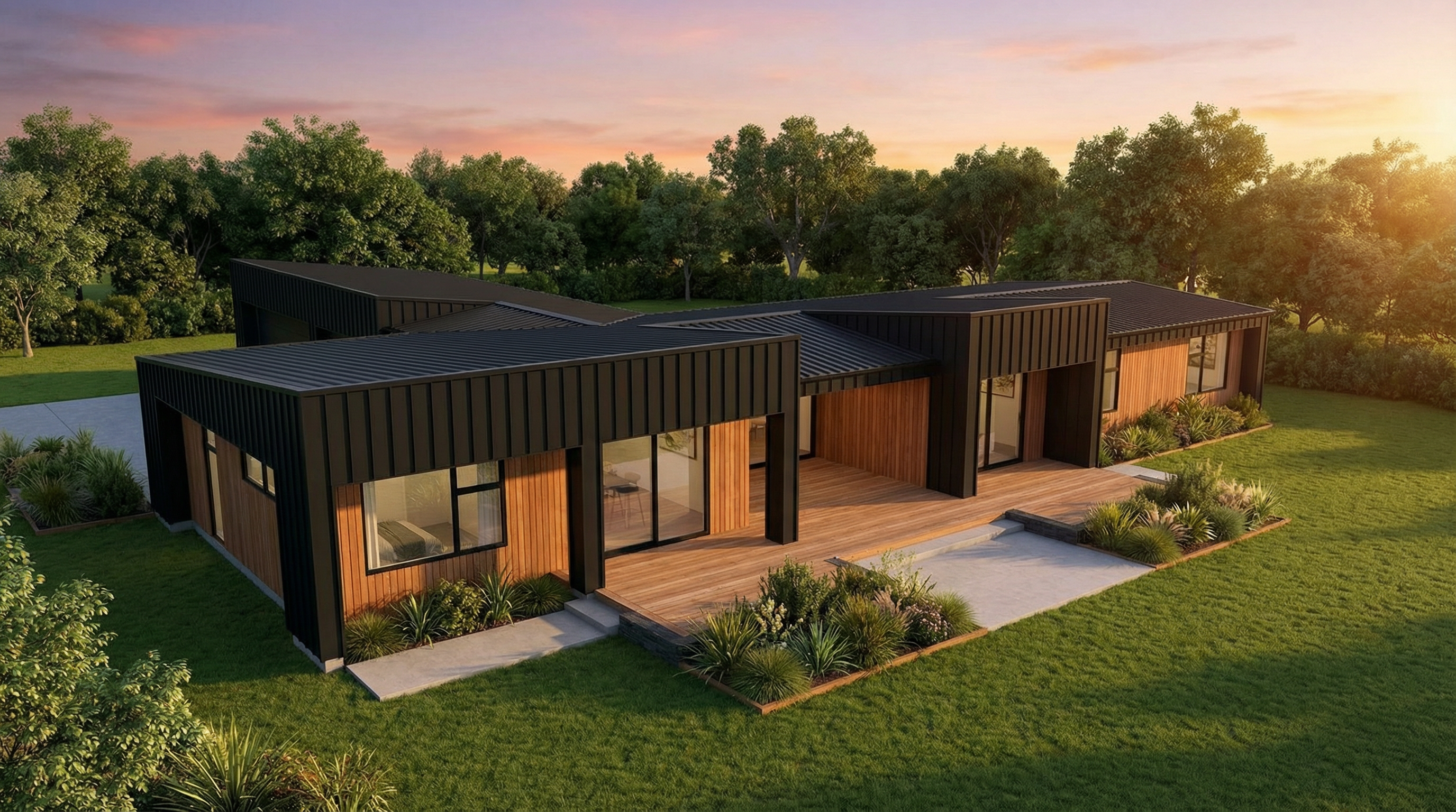 black roof black vertical cladding black window frames low timber deck concrete by garage out back lawns trees in background extensive native planting sunset