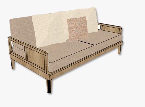 convert this sketchup furniture image into a hyper realistic furniture catalog photograph strictly preserve the exact furniture design geometry proportions and structure do not redesign or modify the object in any way replace the flat sketchup textures with realistic materials such as natural oak wood grain soft fabric upholstery and realistic material depth place the furniture on a clean pure white studio background with soft professional lighting and subtle natural shadows the final image should look like a high end furniture catalog product photo similar to ikea or scandinavian furniture brand photography