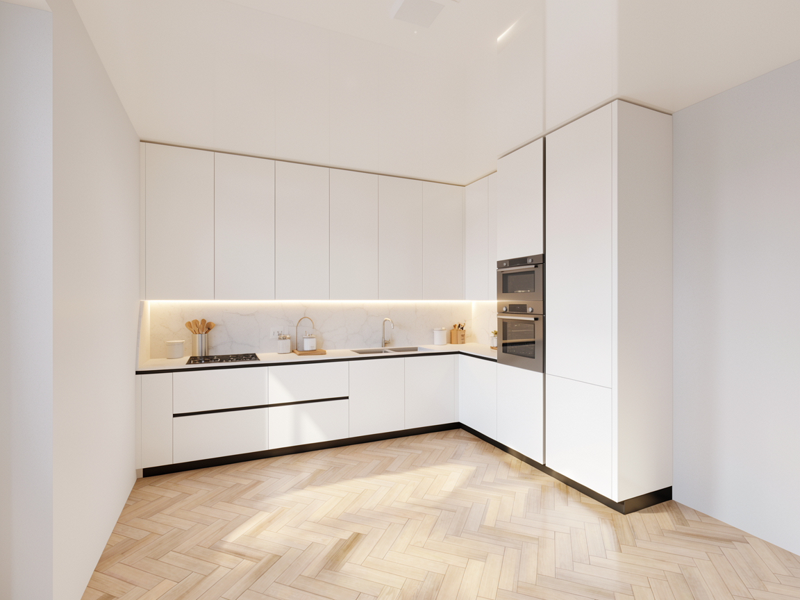 make this photo more realistic keep the checkerboard floor and use the same scale keep the island the same dark olive green color as the rendered image and add paneling that coordinates with the door fronts of the cabinetry make upper cabinets the same cream color as the perimeter bottom cabinets change the windows on the left to exactly match the windows on the north add light natural tan bamboo roman shades to all windows add trim along the entire perimeter of the ceiling make the trim white except the trim above the cabinets don t change any geometry of the bench the bench can only be under one window it must remain the same size and scale update the cushion only to a pale yellow and green and black botanical pattern along with 1 2 pillows in black white and light yellow large and small scale prints update the faucet to a satin nickel finish add two teardrop oval shaped glass pendants above the island add recessed cans around the space about 2 feet in from the perimeter of the room make the entire backsplash a glossy square white tile in varying shades of white add a glass door with mullions into the doorway cutout on the left keep the mullions white add the roman shade here too add a painted wooden door the same color as the walls with a raised panel front to the doorway cutout that leads to the garage near to the fridge put a doormat in front of this door update the fruit bowl to a larger wooden bowl with lemons limes and oranges add a black and white abstract dishcloth hanging off the ledge in between the island and perimeter cabinets add another stool perpendicular to the others so there are a total of three stools remove the flowers under the windows put a chocolate cake there instead on a short white gray marble cake tray add a lush green and white garden outside