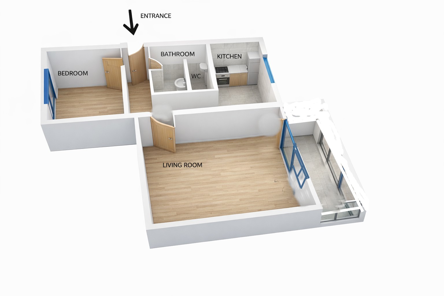 convert this floor plan into a realistic isometric 3d view of a full house show the space from an elevated angle with furniture walls and details visible keep the exact outline as shown in the picture keep all partitions and openings as drawn and do not add any rooms there use the same furniture as shows on the plan do not change the orientation of the floorplan