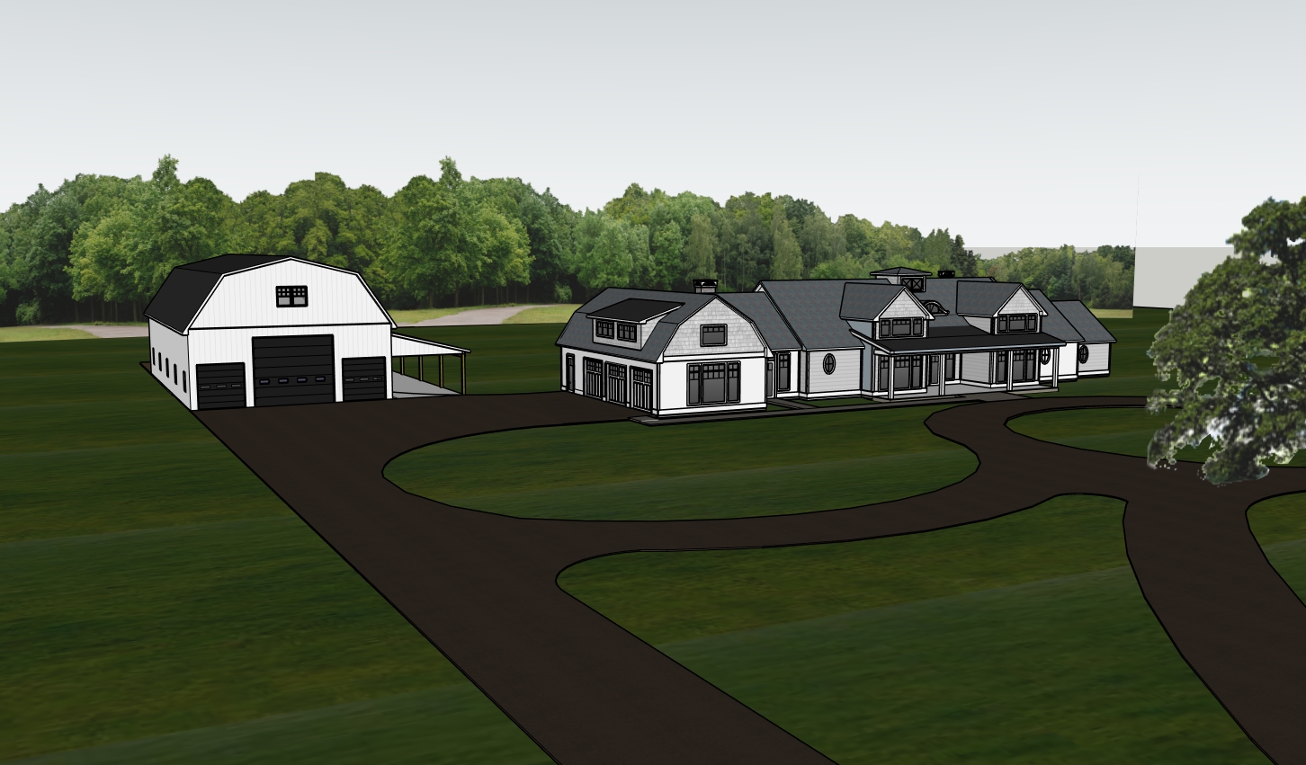 architecture main house connected visually to barn style garage structure strong gable forms with balanced proportions no awkward rooflines clean symmetry where possible but allow slight variation for character timber frame covered porches with exposed posts and beams covered connector or breezeway between structures if visible materials finishes 18 high continuous stone veneer base wrapping house barn and garage cream warm beige horizontal siding not too yellow keep it muted and upscale black window package with wide trim surrounds for bold contrast all exterior trim in black for a sharp modern edge architectural shingle main roof dark charcoal tone standing seam metal roofing on lower slope roofs porches dormers connectors natural timber elements medium to dark stain not orange copper gutters and downspouts with subtle patina not overly shiny windows doors large evenly spaced windows mix of rectangular and occasional specialty shapes round or transom for character grilles minimal or none lean toward clean glass for a higher end feel oversized barn style garage doors with glass inserts landscape design soft natural farm style landscaping nothing overly manicured or suburban layered planting beds with hydrangeas ornamental grasses low shrubs seasonal accents whites soft pinks muted purples curved driveway with clean edges open lawn areas to maintain scale and not crowd the architecture background open field or pasture with tree line lighting atmosphere golden hour lighting warm low sun long soft shadows across lawn slight lens warmth for inviting tone realistic materials and textures no over saturation camera angles wide front perspective showing full property layout angled 3 4 view highlighting depth and connection between structures lower eye level shot to emphasize scale and warmth optional aerial subtle not too high rendering style ultra realistic physically accurate materials clean high end residential marketing look no exaggerated contrast or fake hdroverall vision high end eastern shore farm estate blending refined barn architecture with coastal warmth design should feel rooted in easton md elegant relaxed and intentional not overly rustic not too modern clean timeless and quietly impressive architecture layout unified composition main house barn garage designed as one estate strong gable forms with clean rooflines avoid clutter or overcomplication balanced but not rigid symmetry timber frame covered porches with exposed beams and posts optional breezeway or visual connection between structures barn positioned as a feature element not secondary materials finishes house garage 18 continuous stone base wrapping entire structure cream warm beige siding muted coastal tone not yellow black windows with wide trim for strong contrast all trim in black architectural shingle main roof charcoal tone standing seam metal on lower roofs porches dormers connectors natural timber accents medium dark stain slightly weathered look copper gutters and downspouts light natural patina barn key feature vertical metal siding matte finish neutral tone dark bronze charcoal or muted black accent materials that tie into house stone base same 18 select wood timber accents matching roof approach shingle or metal depending on cohesion but keep it consistent with estate windows doors awnings black window package throughout wide trim on house slightly simpler trim on barn oversized barn garage doors with glass inserts metal awnings over barn and garage windows doors standing seam style dark bronze black tone simple clean lines no decorative brackets unless very subtle landscape design eastern shore feel natural slightly coastal farm landscape not overly manicured soft flowing planting beds that complement not compete include hydrangeas key feature for coastal md feel boxwoods ornamental grasses lavender soft florals loose elegant layout nothing tight or suburban curved driveway with clean edges open lawn areas to preserve scale background flat farmland open fields tree lines typical of easton md lighting atmosphere warm eastern shore golden hour lighting slight humidity softness in the air adds realism for md coastal region long shadows across lawn warm inviting tones subtle not overly saturated camera angles wide front shot showing full estate layout 3 4 angle highlighting barn house relationship lower eye level perspective for warmth and scale optional soft aerial keep realistic height rendering style ultra realistic clean high end real estate visualization physically accurate materials no overdone hdr or artificial contrast best archsynth settings mode photoreal exterior real estate creativity medium low keeps your design intact structure preservation high detail level high ultra