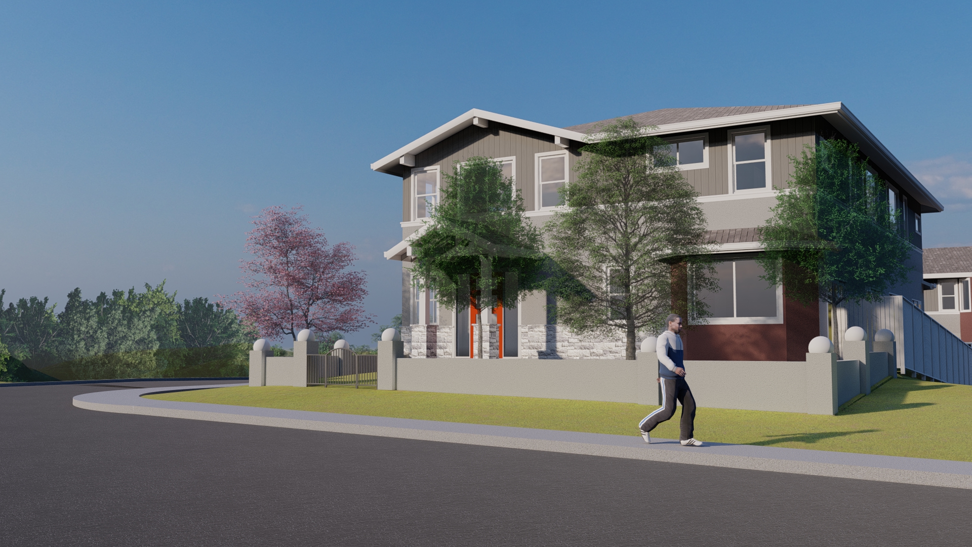 render a luxurious row of modern homes with light grey stucco walls and dark gray asphalt shingle roofs the walls on the second floor from the second floor window sill and above is a vertical board and batten siding material with the remaining a light grey stucco the homes are set on a lush vibrant green hill the scene is under a clear blue sky with a few fluffy white clouds pine trees and dense forest in the background enhance the tranquility the atmosphere is peaceful and serene capturing a sunlit afternoon there is a person walking by suggesting an air of welcoming architecture
