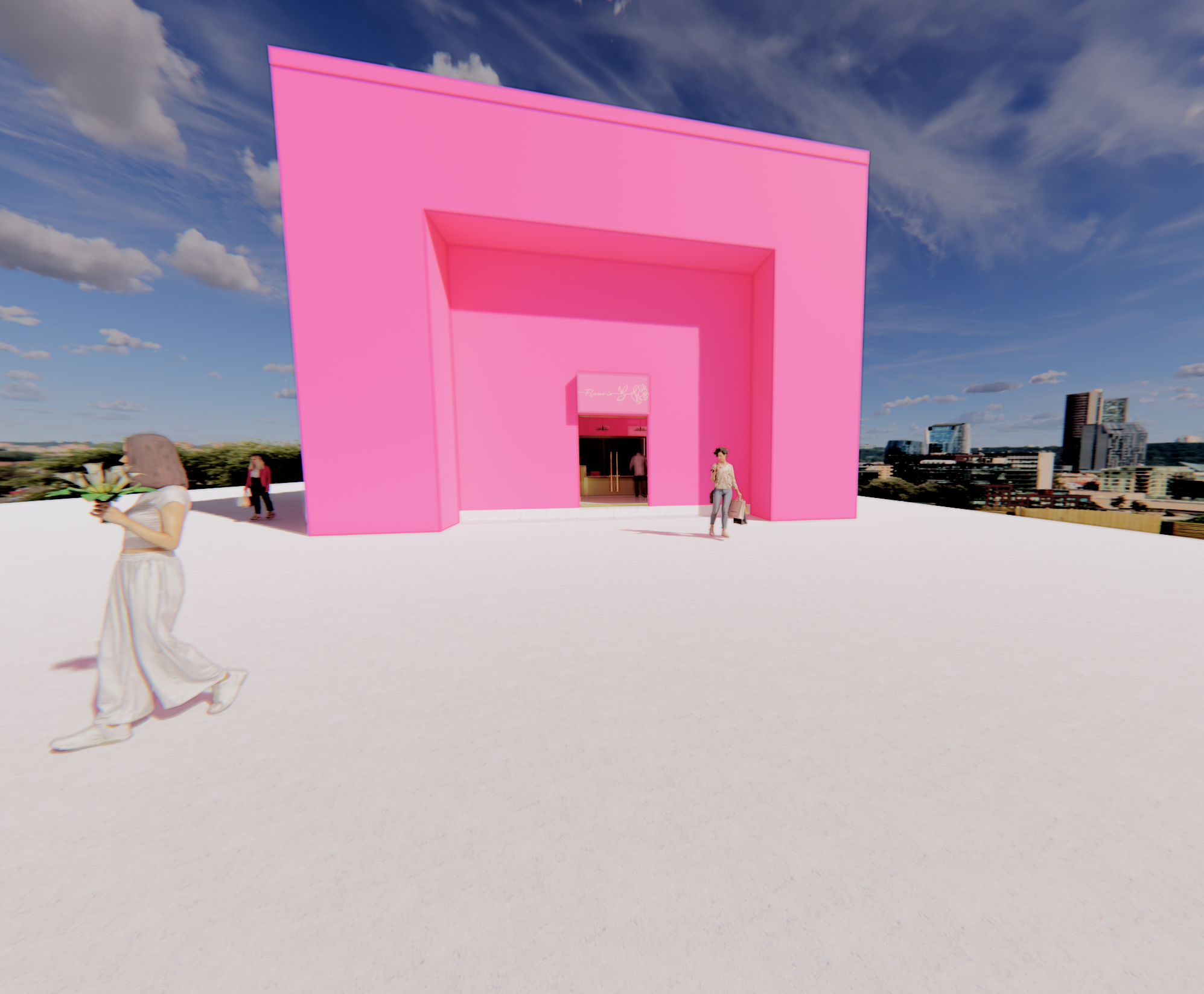 bright hot pink exterior a cleas glass double door and gold handles the background is a city landscape with clouds in the sky people are walking around with bouquets large 3d realistic looking flowers are placed on the inside wall not the two walls that come out the flowers should be roses that are bright hot pink there should be arranged like a flower box would be the looks realistic and have the same perspective as the original picture