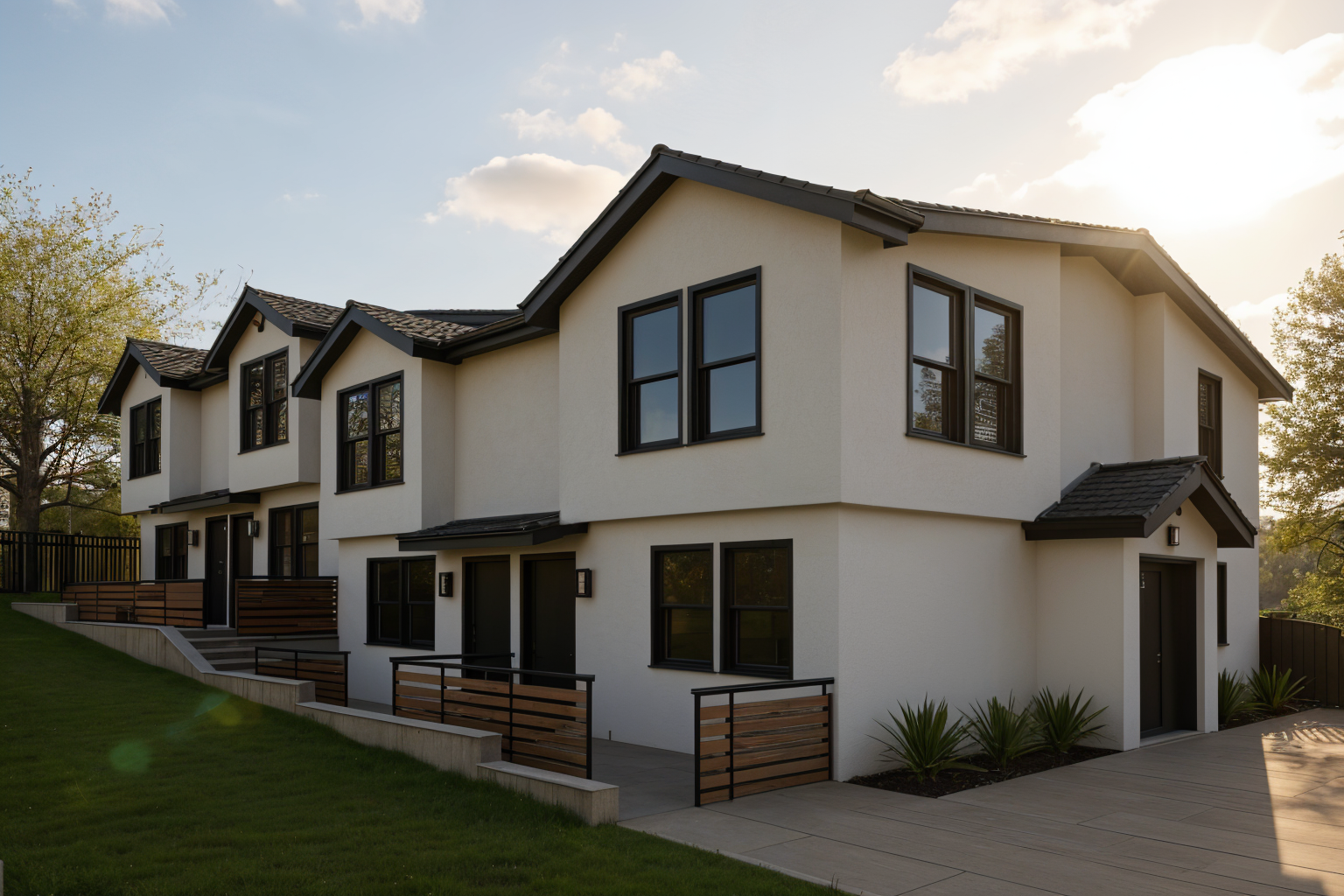 white stucco exterior black windows trim black fascia black gutters black door metal awnings wood and metal railings grass in foreground concrete driveway partly cloudy sky hazy asphalt shingle roofing photorealistic