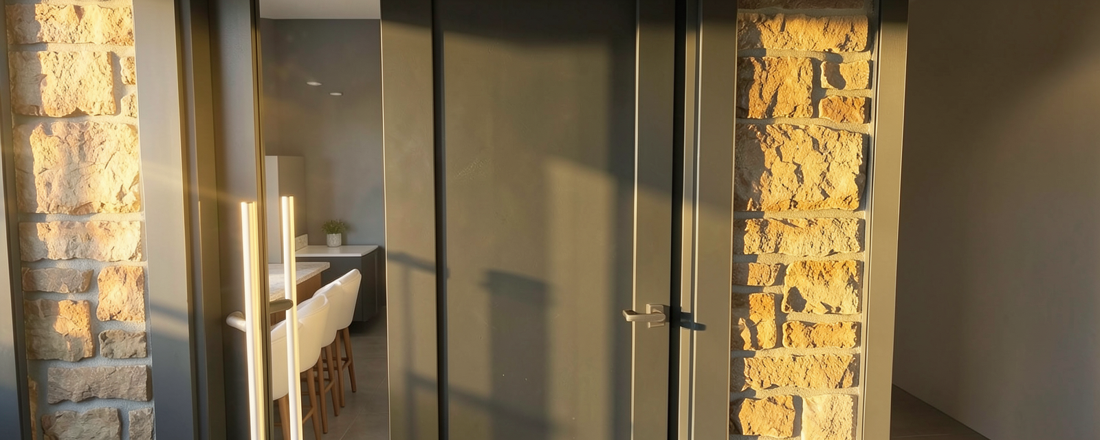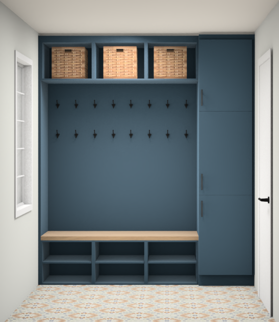 recessed lights in the ceiling coats in the hooks shoes on the shelves