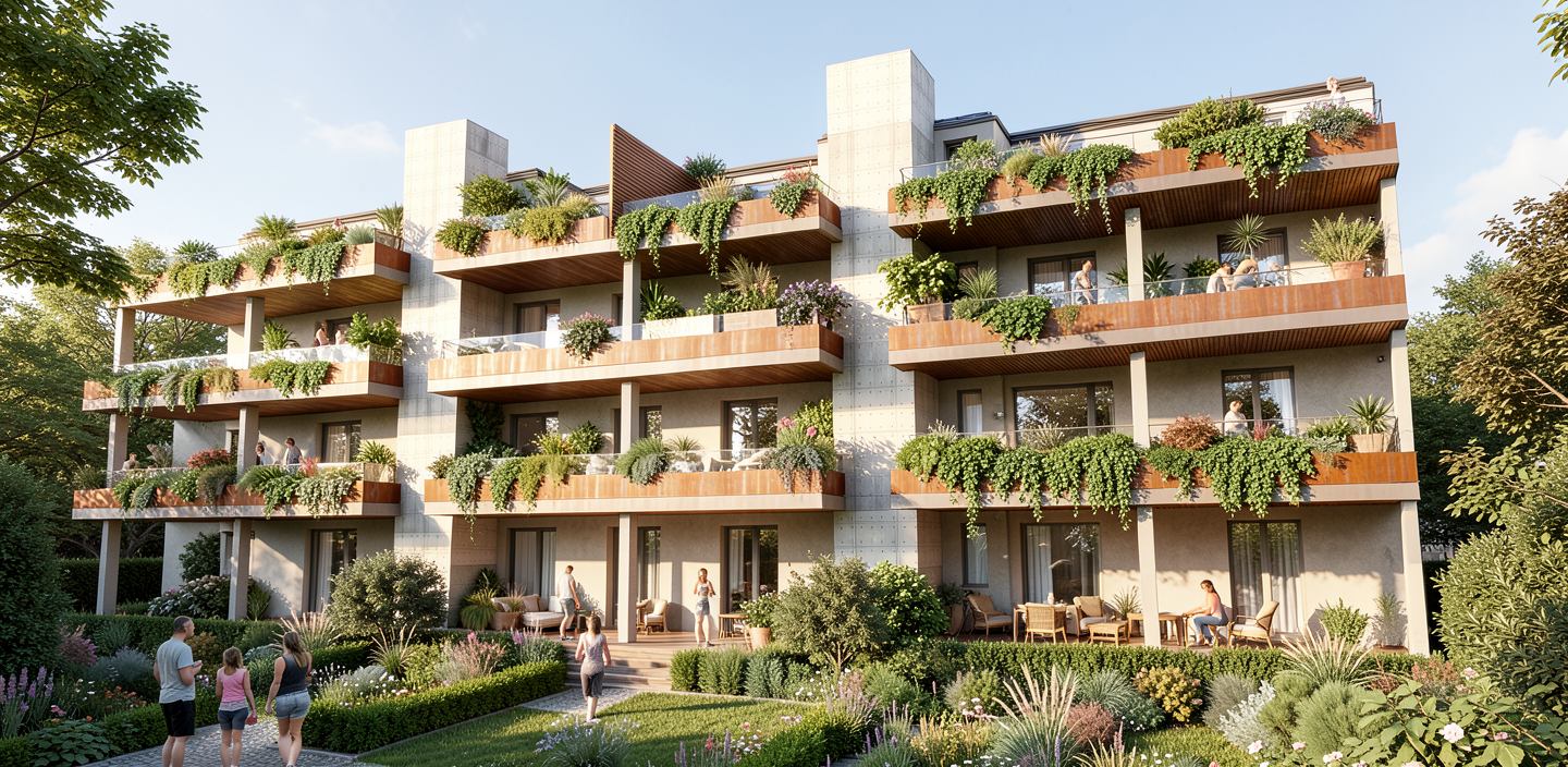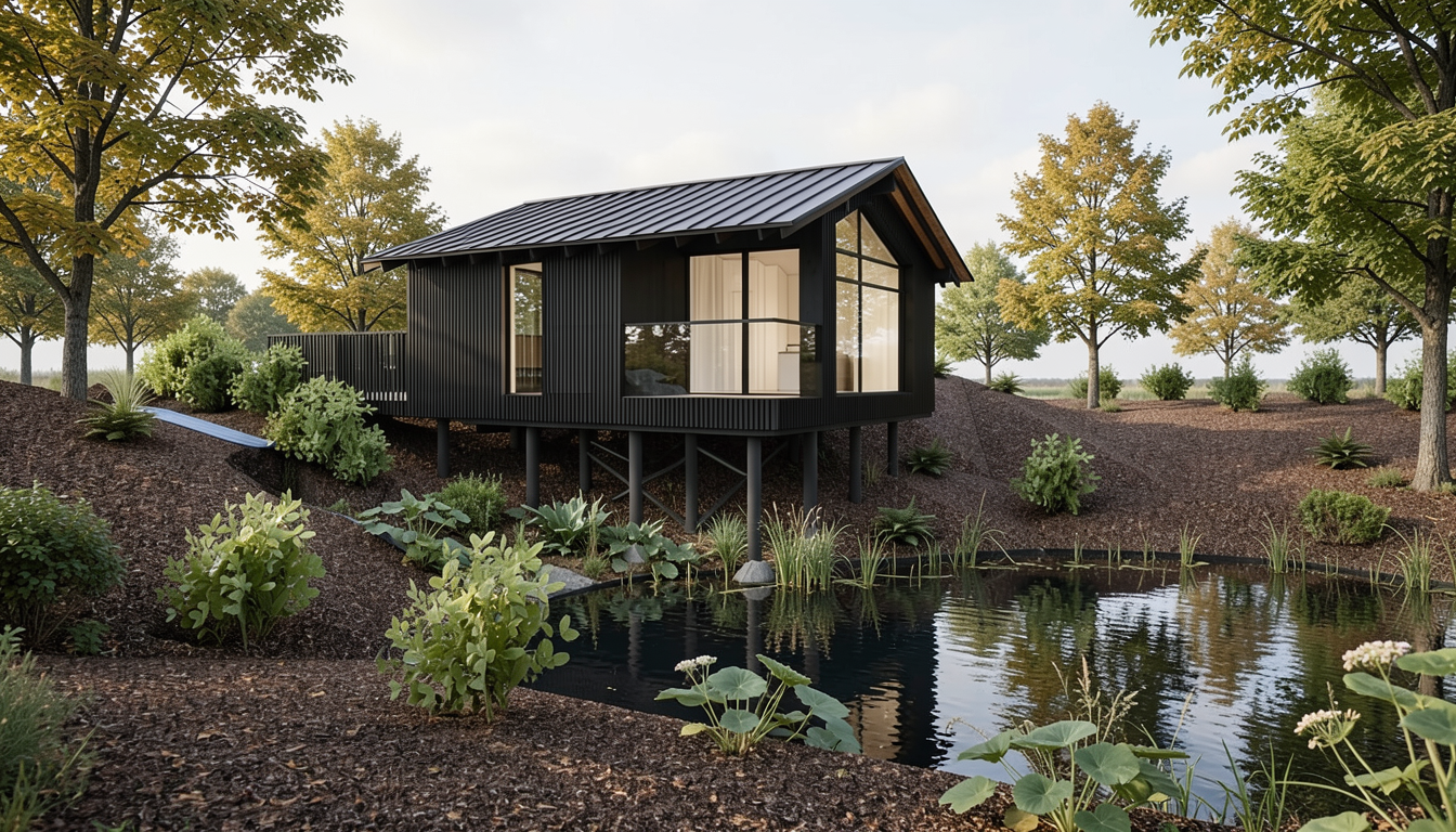exterior realistic image of a luxury modular house retreat with organic and wavy shaped exterior walls the bedrom is on the right the bed is on the center of the wall with nightstands on each side and different bed side lamps on the right there is large corner window and a hidden bathtub behind the wall with the bed the floor under the bathtub is covered with small white stones and the bathtub is surrounded by tropical plants the floor of the bedroom is made from hardwood floor natural tone with cracks and wear areas to look more realistically the interior walls are cladded with a bumpy textured surface that looks like sand dunes beige and earth tones on the middle there is a 2 sided fireplace that you can see both from the bed and the living area in the left there is a living room area with a kitchen in back the couch and armchairs have natural earthy tones there is a natural linen carpet under the couch area all the interior walls are cladded with a with a bumpy textured surface that looks like sand dunes the exterior walls are finished the same as the interior ones there are plants around the terrace there are multiple interior lights that set a calm and relaxing tone with warm light and sift shadows there is a deck with 2 chairs and a small coffee table all made from natural materials format picture 16 9 the exterior windows have a wooden natural finish frame sharp details on all elements
