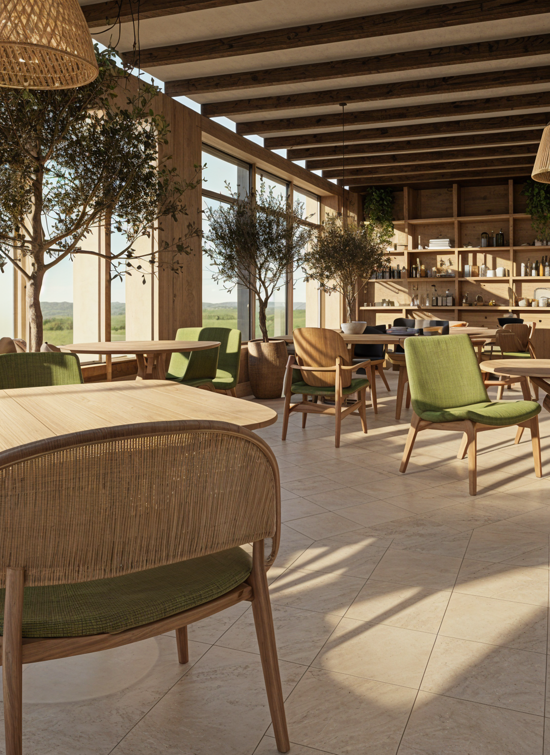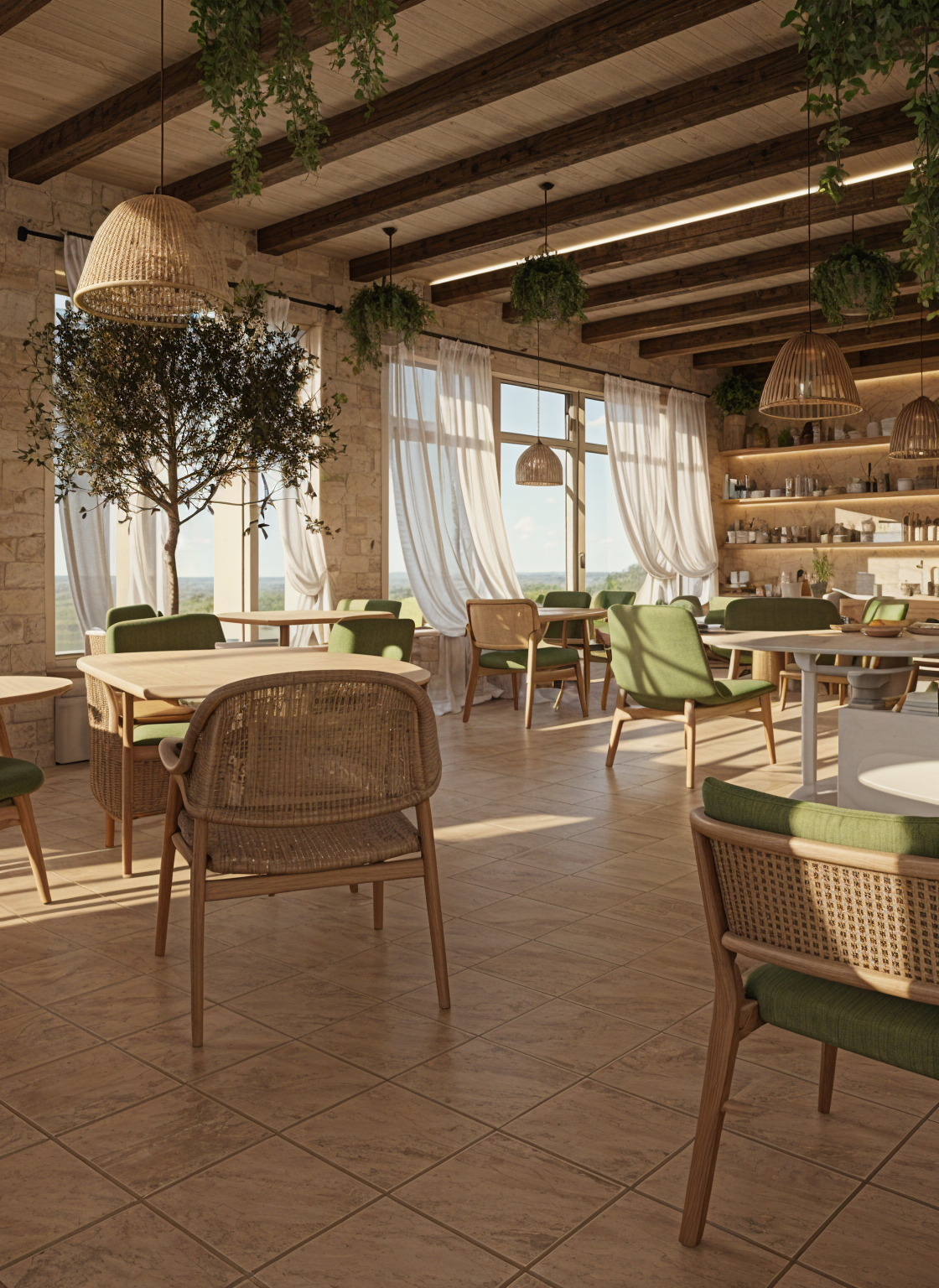 transform this base 3d model into a modern mediterranean tavern caf with authentic coastal charm keep the original geometry but enhance it with natural textures warm limestone walls aged wood beams and matte plaster surfaces add hanging greenery cascading from the ceiling olive tree planters and soft sunlight entering through open windows fill the wooden shelves with assorted wine bottles local spirits and small ceramic details use warm ambient lighting with golden tones and subtle shadows the style should combine rustic mediterranean tradition with modern minimalism natural materials elegant simplicity and artistic composition create a cinematic highly aesthetic and photorealistic atmosphere that feels calm timeless and inviting add curtains so we dont see outside