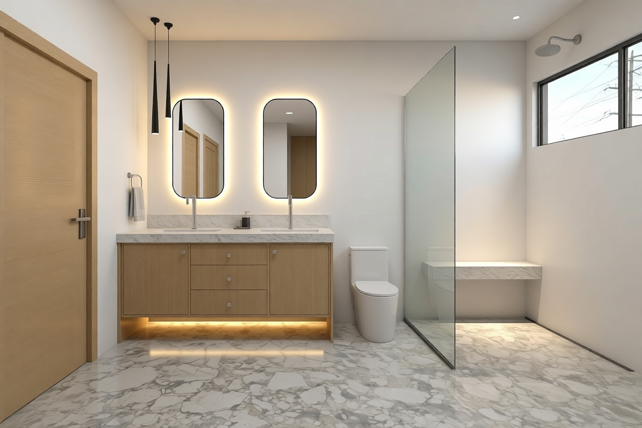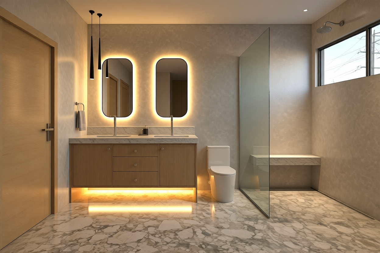 ame camera angle same composition same interior design do not change any geometry d cor placement or color tone enhance realism refined lighting balance realistic ies like light distribution if present natural shadow gradients improved material definitions fabric weave timber grain stone pores accurate specular highlights glass reflections cleaner edges less render noise final image must look professionally post rendered while remaining identical to the original proposal