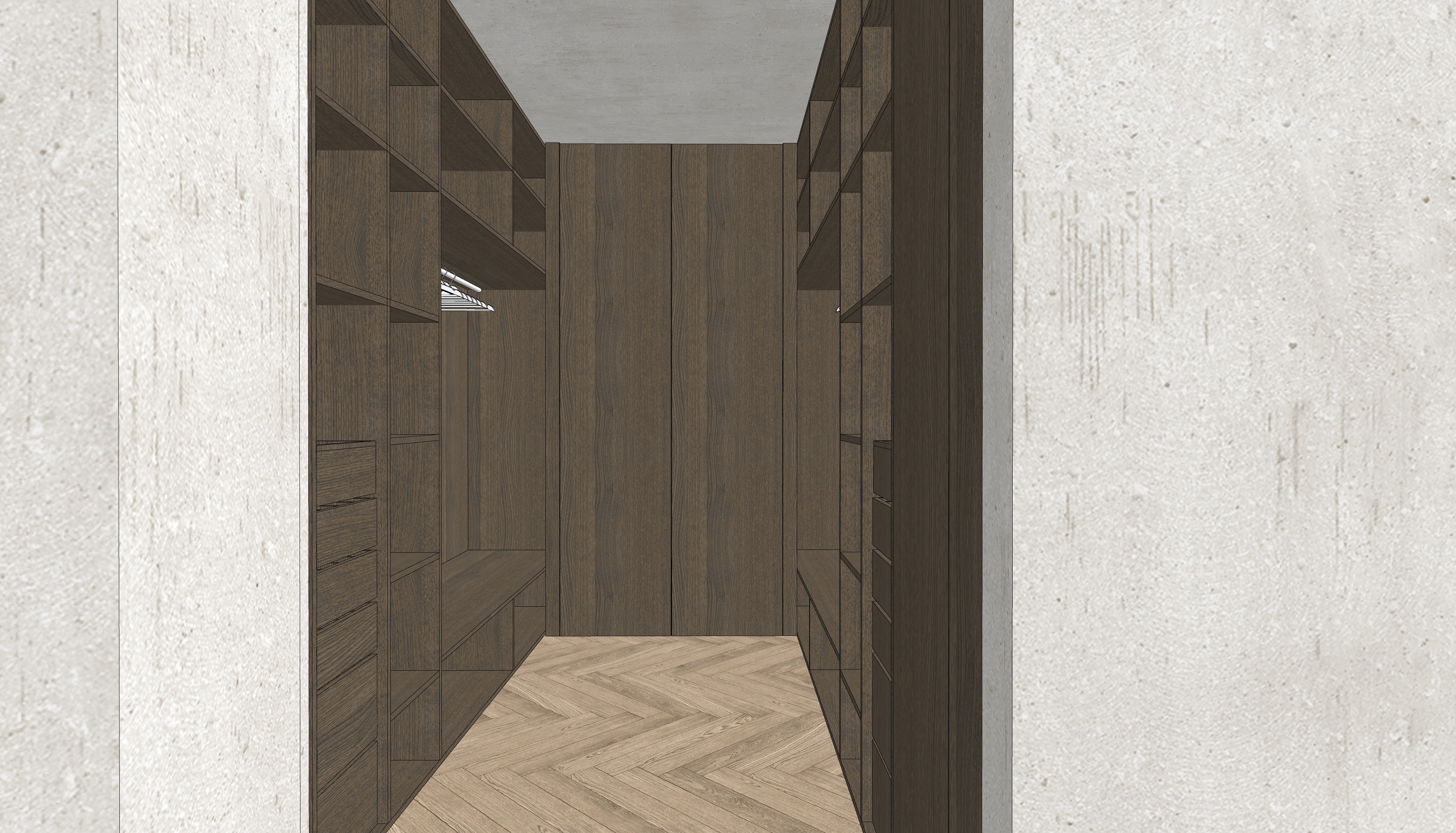 make render of wardrobe preserve wood on furniture make wood herringbone floor light beige plaster of microcement add spotlights on ceiling small recessed add clothes