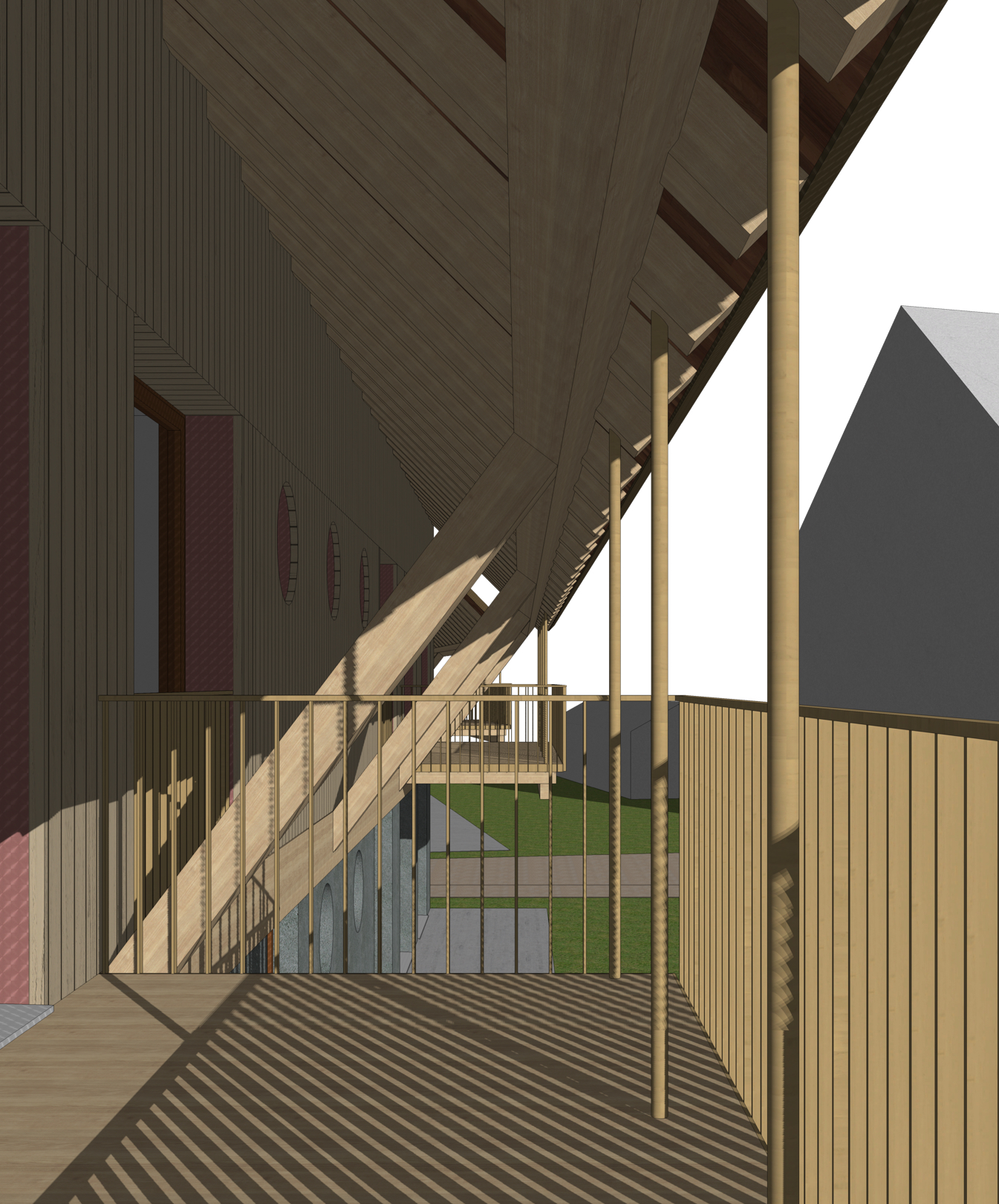create a realistic photograph of a detail of a buinding the wall is in wood panels keep the geometry