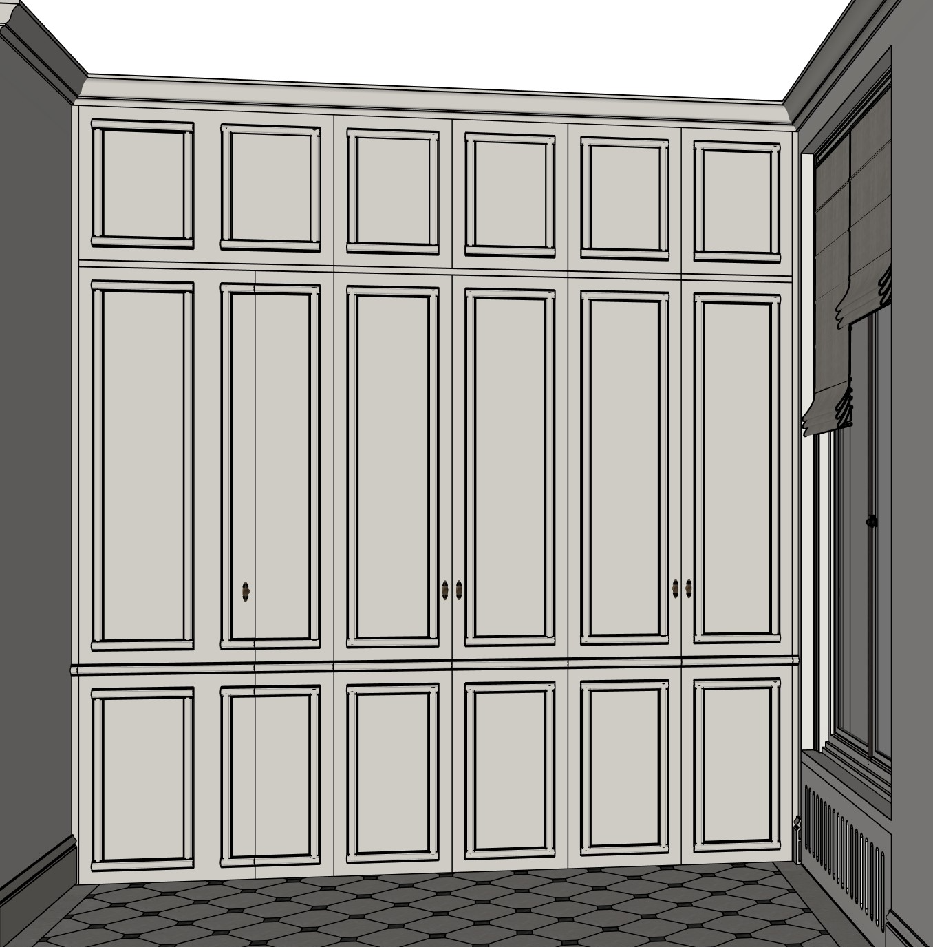 the cabinets are in farrow and ball purbeck stone https www farrow ball com fr peinture purbeck stone the apartment is located on the 3rd floor of a parisian apartment overlooking a courtyard only the smallest tiles are in black the other tiles are in light greige the door handles are in brushed brass