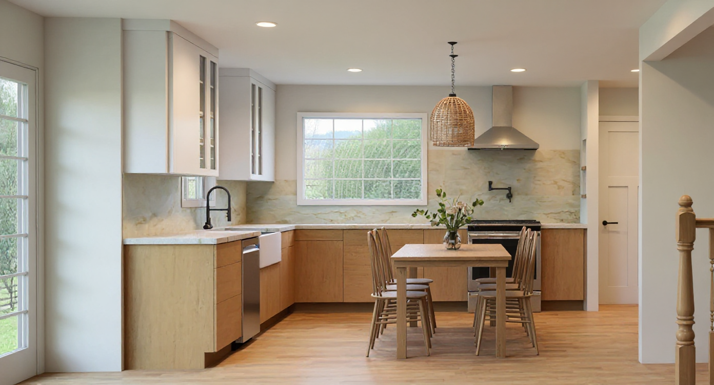 add recessed lights to the ceiling change the view from the window to more green nature and the glass to cleaner change the shade of the backsplash to a lighter one the walls are white