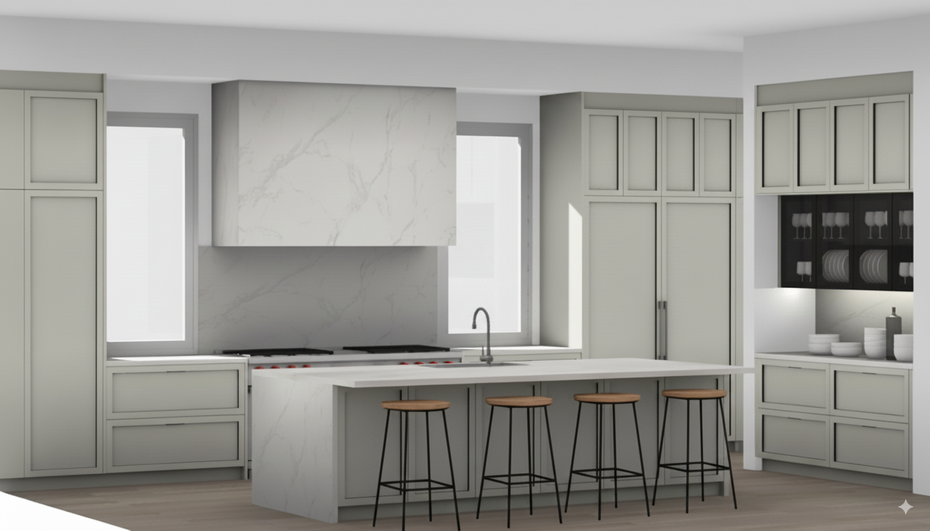 enhance this image by adding realistic texture and depth to the materials while keeping the original fidelity of the cabinets preserve the exact colors shapes and models of the cabinets but make the surfaces reflections and lighting look as realistic as possible as if in a real life photograph keep cabinet model make cabinets in matte paint keep refrigerator and freezer panel ready