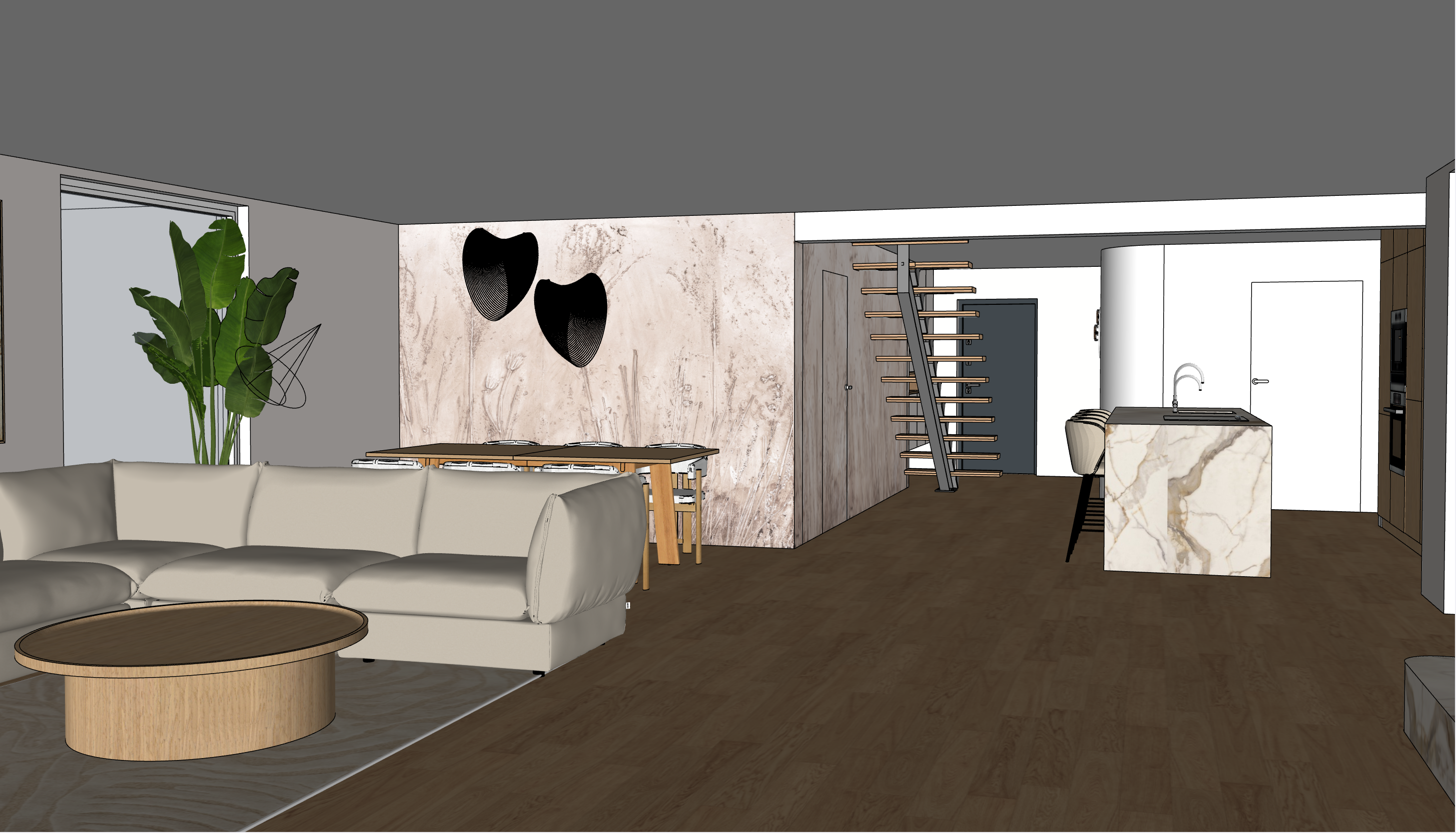 modern kitchen and living room floor timber oak light day light no lights hanging above the kitchen island
