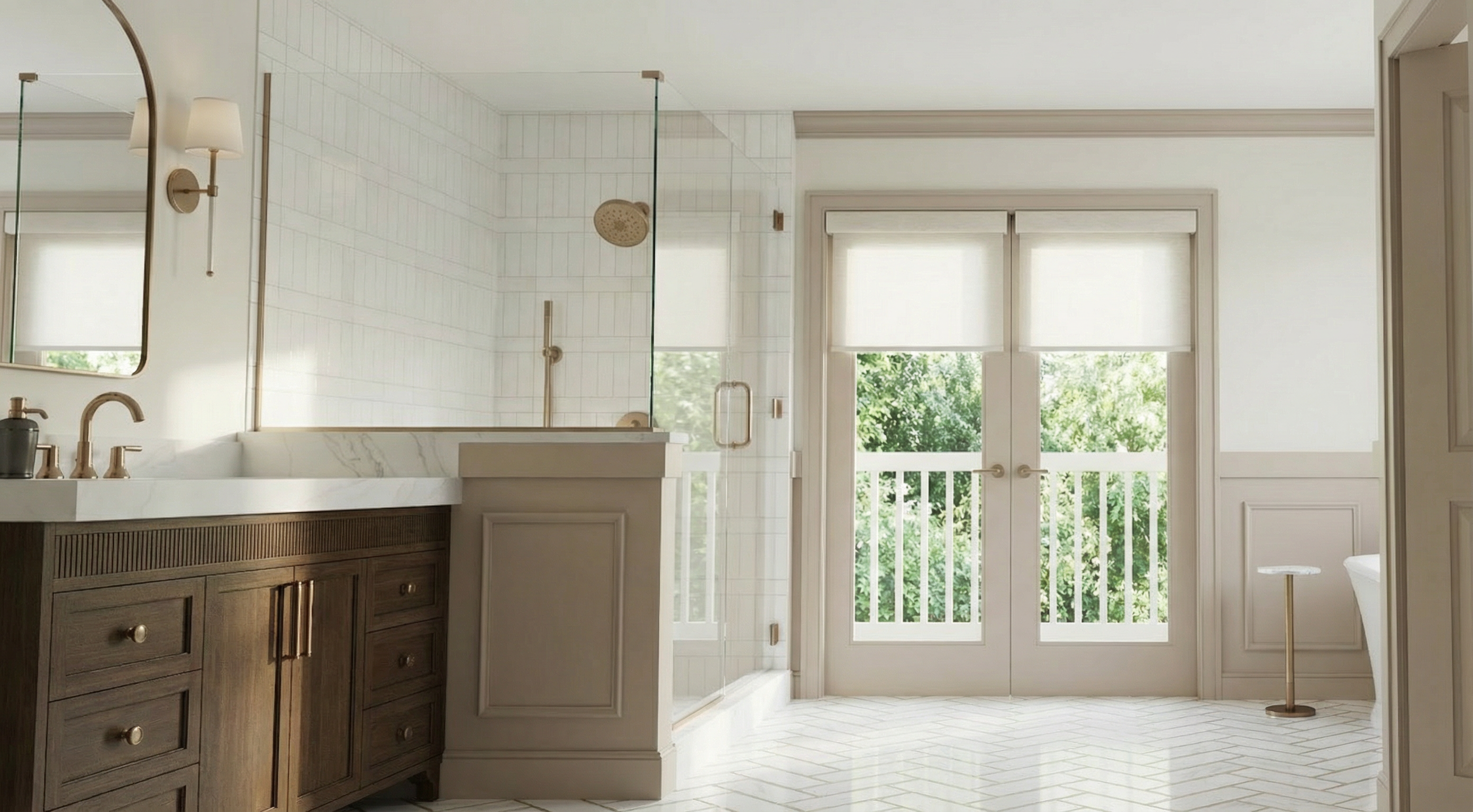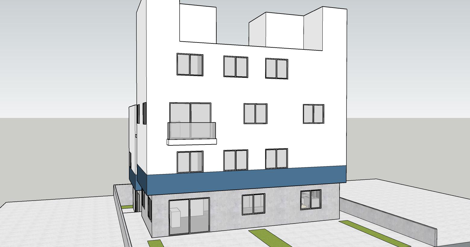 ultra realistic daytime exterior render keep exactly the same camera angle and perspective and show the full original image without any cropping no design changes white stucco building with blue accents gray areas must have gray brick veneer texture ground floor and perimeter wall must have board formed concrete texture modern gray concrete parking with three grass strips bright daylight blue sky realistic shadows and reflections right side small trees and palm trees low height dense vegetation rear visible gray 2 story house with flat roof all materials must be high quality clean and look brand new
