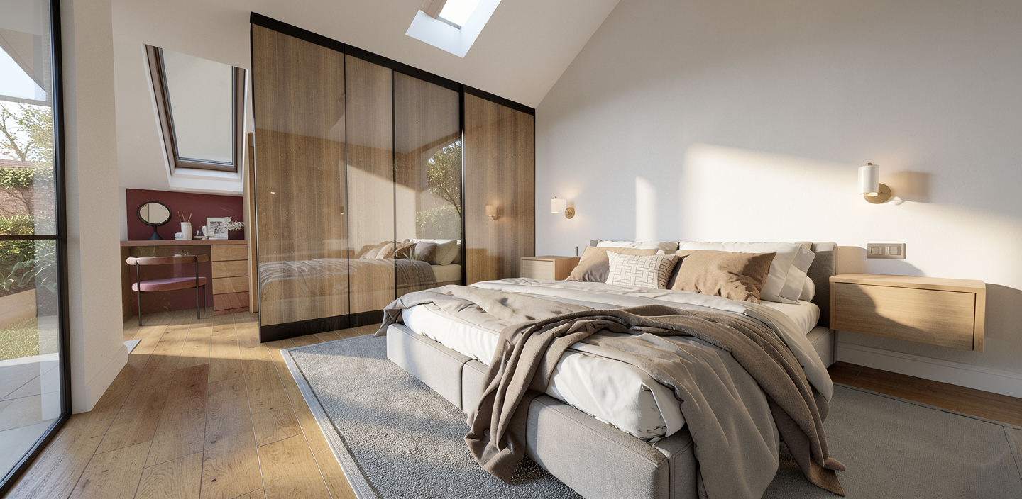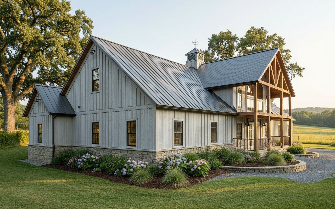 design a refined modern barn style structure based closely on the attached reference building the layout proportions and architectural language must remain consistent with the reference image do not redesign the structure improve realism landscape and presentation quality architecture a large timber frame inspired modern barn building with clean proportions key architectural features to maintain large gable roof mass standing seam metal roof in charcoal gray timber frame style porch with heavy posts and exposed truss small cupola centered on roof ridge with windows and weather vane vertical wood siding in weathered light gray natural barnwood tone stone foundation base wrapping the building symmetrical window placement with divided light windows timber accents at the gable end covered front porch with railing and steps long secondary wing extending from the main barn mass keep the architecture simple rural and timeless the building should feel like a high end barn conversion or luxury agricultural structure not suburban or overly decorative materials primary materials weathered gray wood siding natural timber beams and posts standing seam metal roofing fieldstone or pennsylvania fieldstone foundation black or dark bronze window frames secondary materials natural wood porch decking black metal railings stone steps textures should be extremely realistic with subtle weathering and natural imperfections lighting use natural golden hour lighting soft warm sunlight hitting the front porch and timber framing long shadows across the ground to emphasize texture interior lights should glow softly through windows lighting should feel cinematic but realistic similar to high end architectural photography landscaping upgrade from reference improve the landscape to feel professionally designed while staying rural include native grasses perennial planting beds along foundation hydrangeas and ornamental grasses low stone retaining edges natural mulch beds landscape should feel natural low maintenance agricultural estate style avoid suburban landscaping patterns ground surface should include gravel driveway natural lawn areas soft wild meadow edges further from the house environment rural countryside setting with rolling fields large mature oak trees soft background hills natural sky avoid suburban houses nearby the property should feel like a quiet agricultural estate or countryside retreat camera rendering requirements generate multiple architectural angles include front hero perspective slight aerial 3 4 view porch level perspective side elevation perspective rear perspective use realistic architectural photography camera lenses 28mm 50mm depth of field should be subtle and natural rendering quality ultra photorealistic architectural rendering highly detailed materials natural lighting soft shadows true to life reflections on metal roof the final render should resemble professional architectural photography rather than a digital model a frame rooves on left and right size running opposite of main roof line keeping this design ad exterior aesthetic show me a rendering of the left side view no extra additions