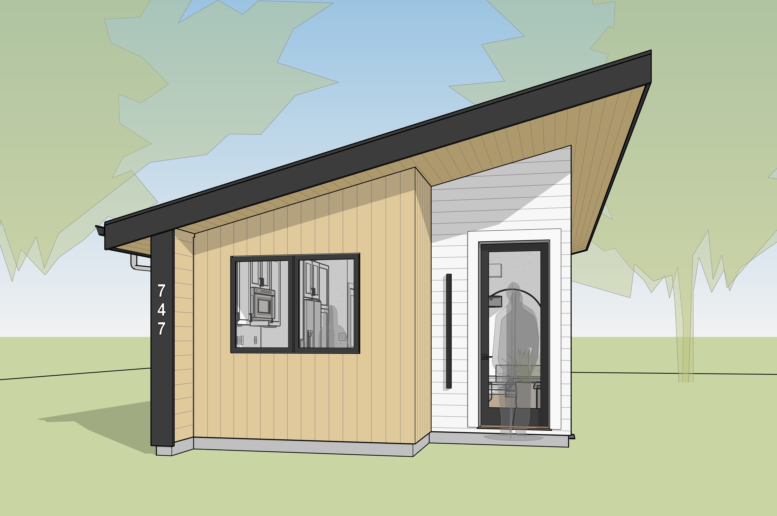 render to look like it s in a single family residential neighborhood in bend oregon keep all trim black windows and door black vertical wood siding stays and horizontal white lap siding to look like cement board lap siding painted off white