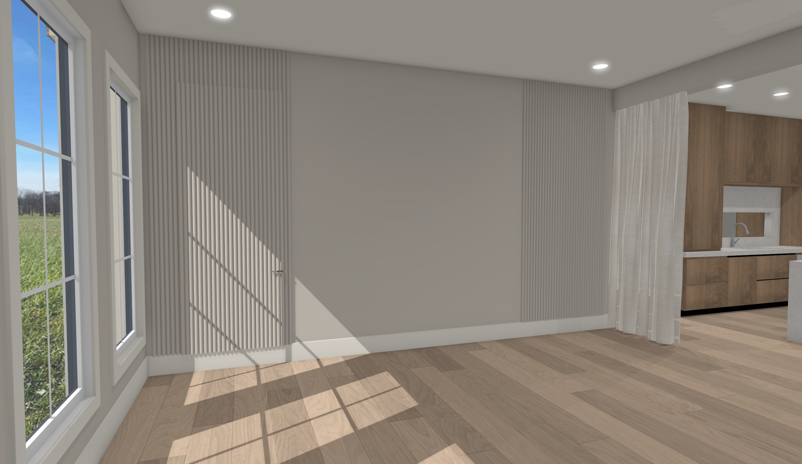 make this image a photograph the walls are sherwin williams modern gray and the baseboard and window casing and ceiling are sherwin williams white flour please leave the door handle on the hidden door