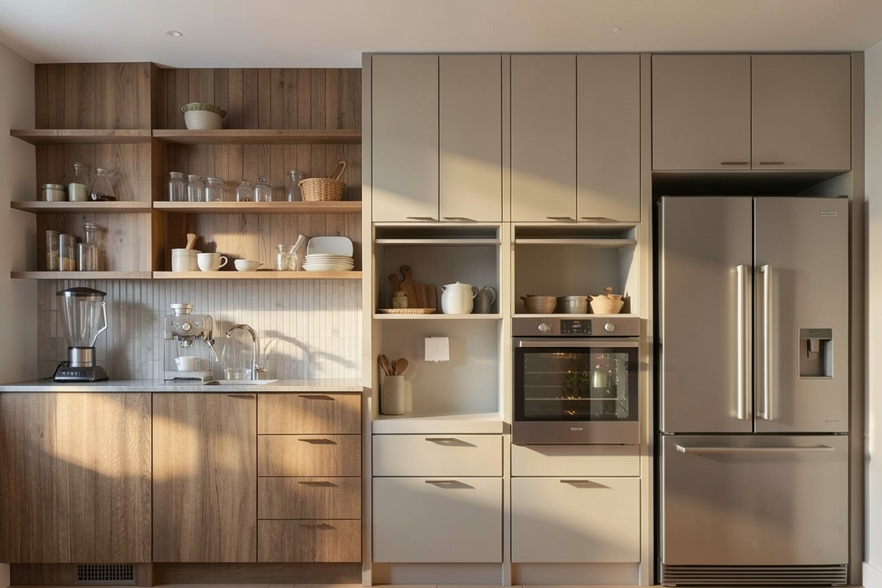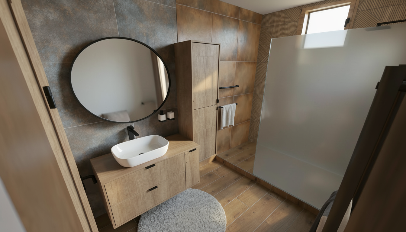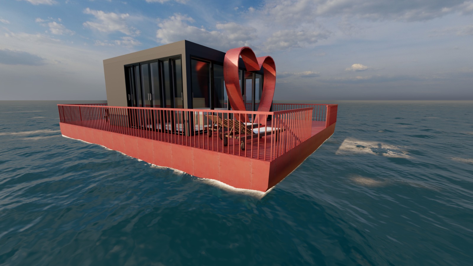 a futuristic floating platform on the ocean designed as a modern architectural studio the structure features sleek metallic surfaces solar panels glass walls and open decks overlooking the water the setting is during golden hour with warm sunlight reflecting off calm waves the design blends science fiction aesthetics with sustainable architecture elegant minimalistic and functional surrounding environment includes distant horizons and light ocean mist highly detailed and realistic render platform railing and heart is metalic material painted red and wall should be wpc material wood texture