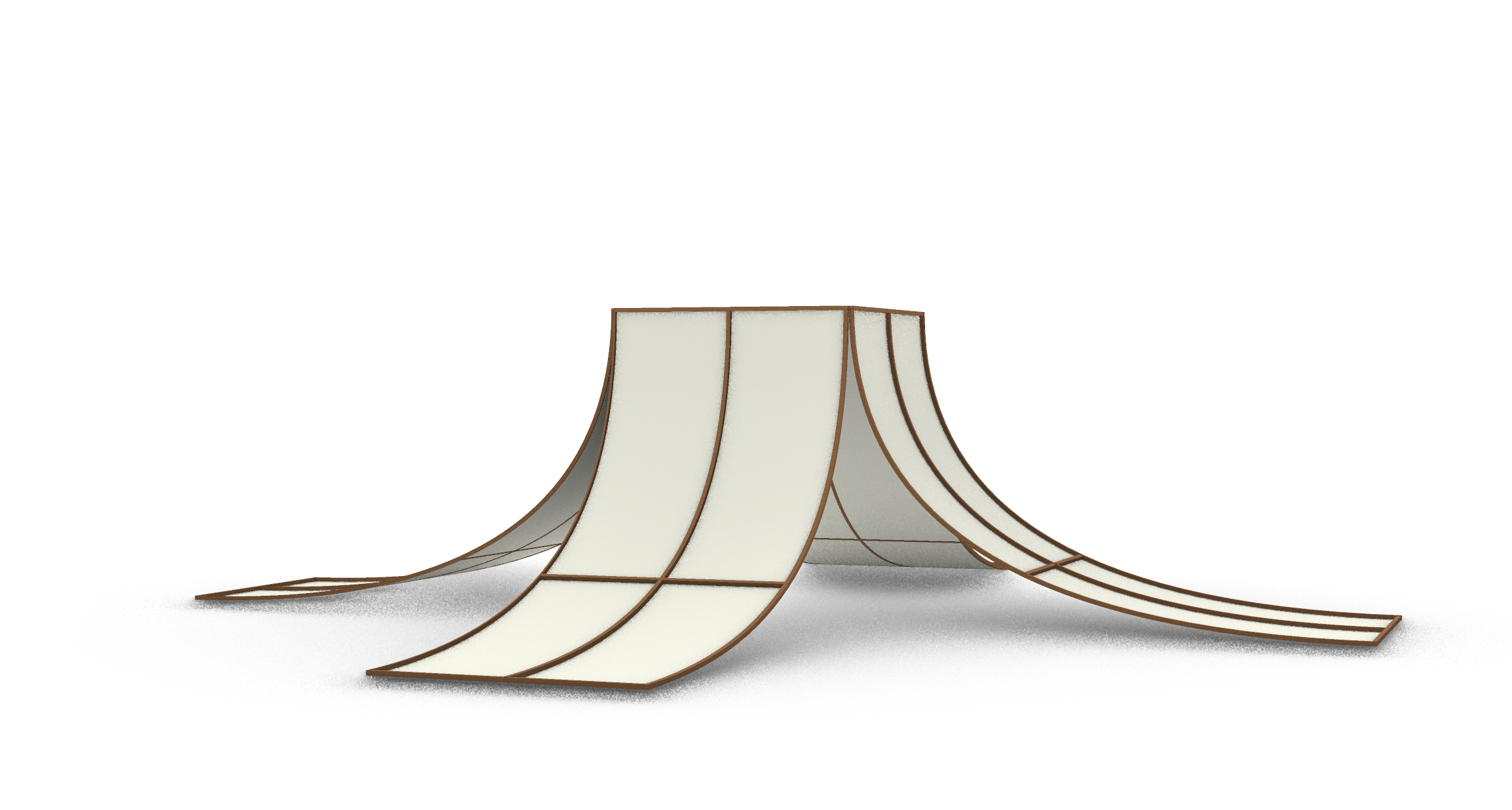 pavilion made of timber edges and linen fabric put it inside a park in a outdoor peaceful simple minimalist and elegant settings a few simple minimalist people standing underneath