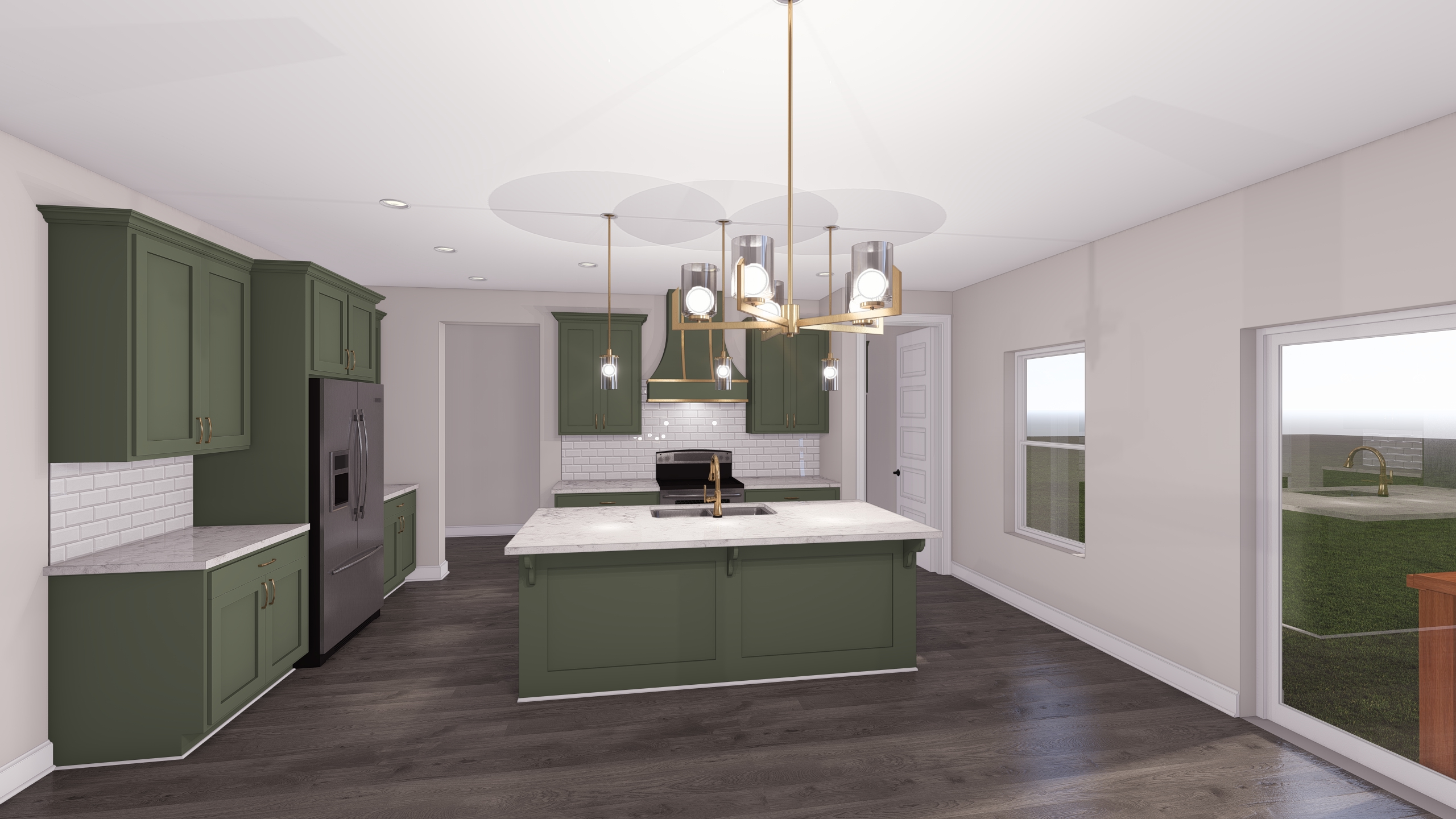 a high end hyper realistic professionally styled real estate photograph of a modern kitchen natural light floods the space creating a soft even and airy feel the three pendant lights are black plastic with brass metal and the bottom half are glowing diffusely the light is balanced to capture the texture of the marble countertops with slight veining and gloss the bar stools are gray semigloss wood with no graining that matches the cabinets the tile on the backsplash matches the countertops with a subtle gloss add lighting under the cabinets and microwave all appliances are high end stainless steel