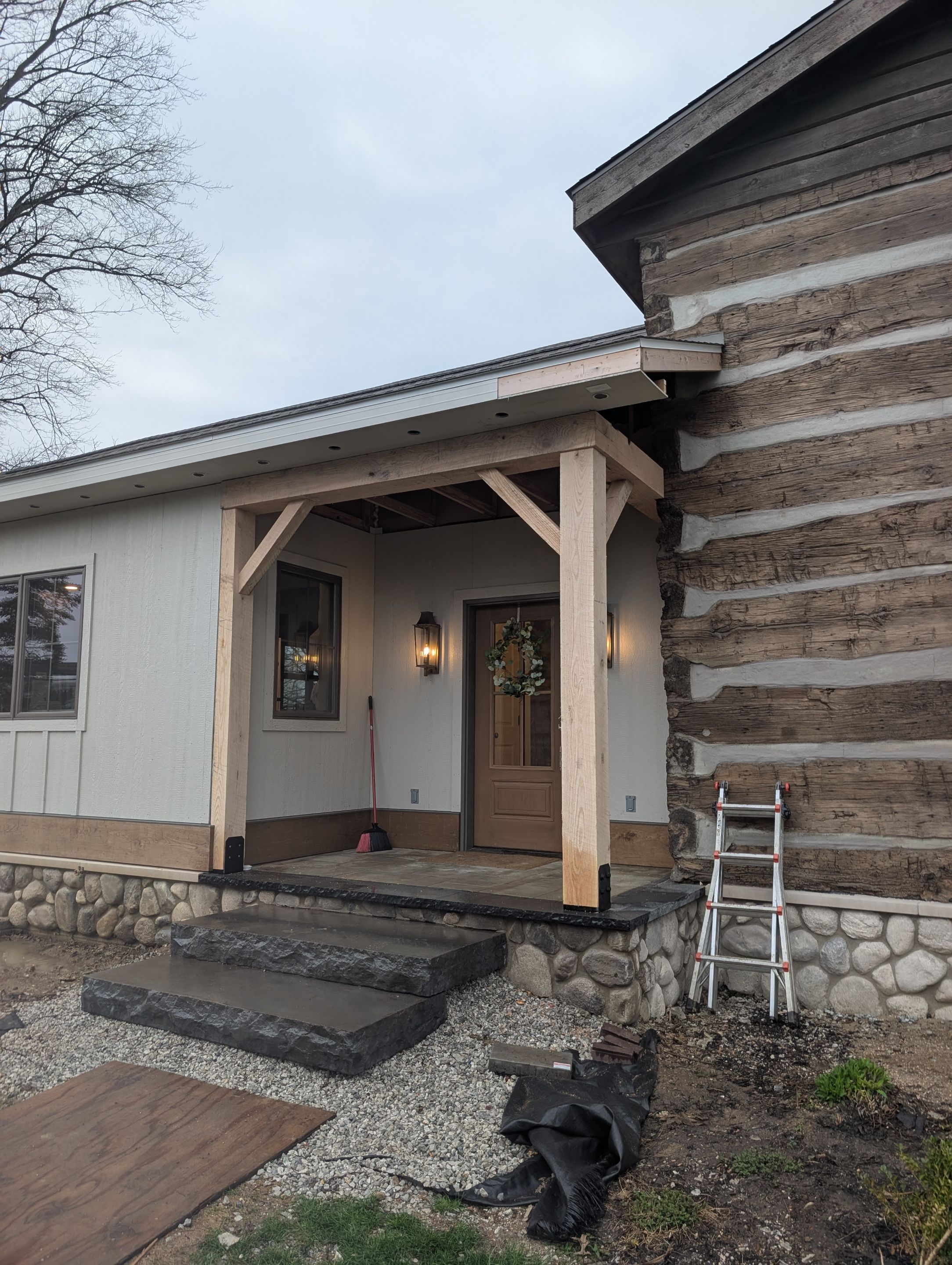 clean this exterior up and make it look like a finished home continue the board n batten on the exterior wall and into the porch as shown omit the ladder and broom
