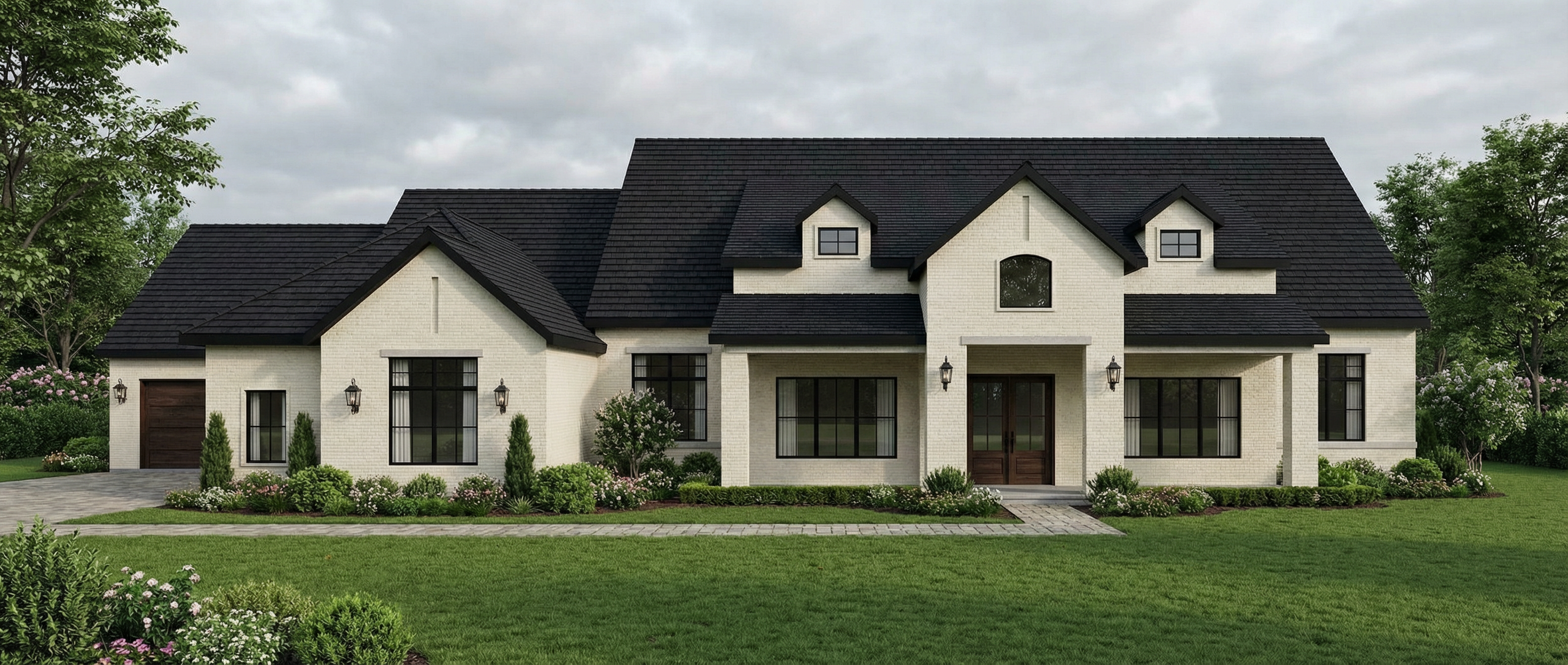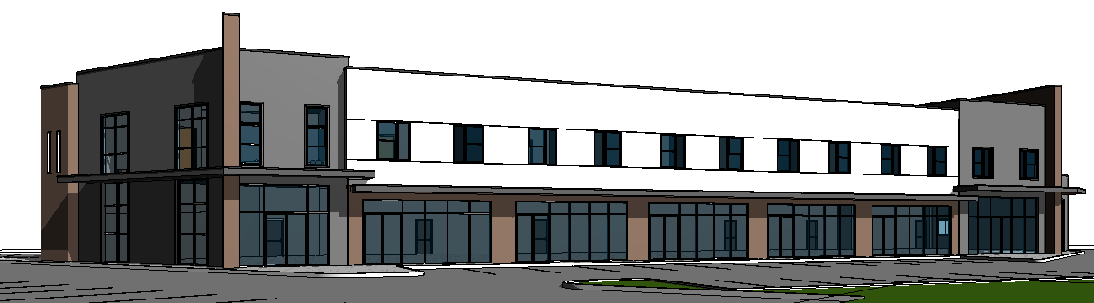 modernist exterior shot generate a photorealistic high quality rendering of this image with high reflective glass on the storefronts soft warm interior lighting soft warm exterior lighting remove all marks on the glass don t modify geometry or storefronts layout architecture