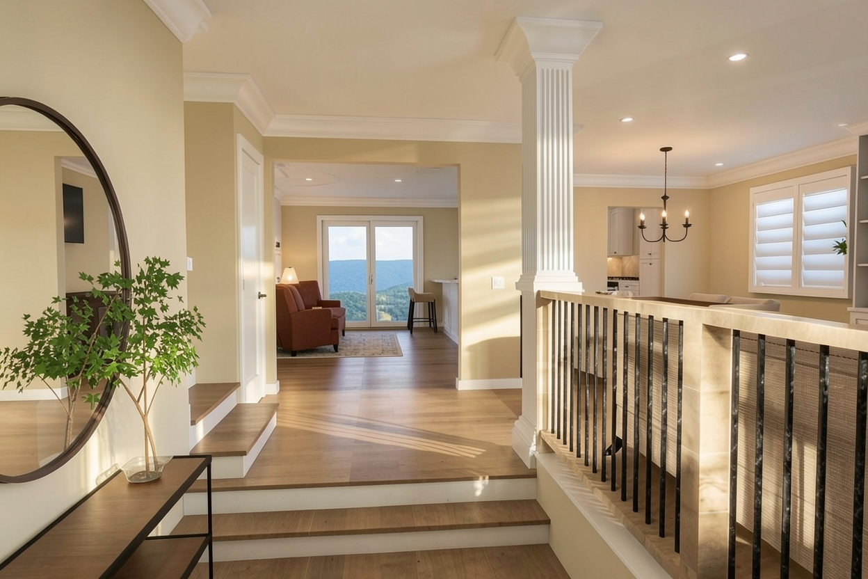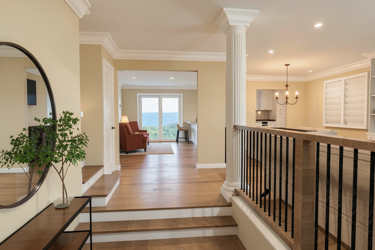 dark modern stacked stone at the entry from ground to roof no overhang