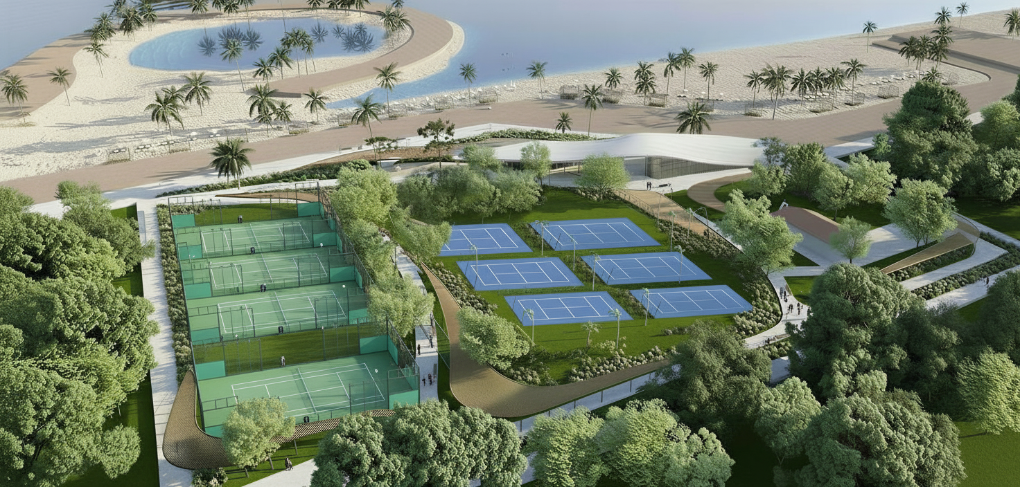 add small bushes between the courts add tennis court fencing separated and padel court fencing