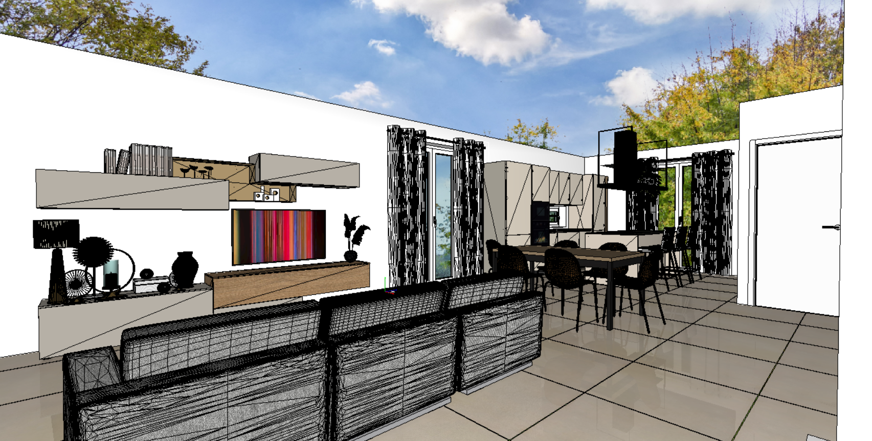 keep the original colors put a texture with warm natural colors on the sofa make the ceiling white throughout the entire composition the light will be daylight from the windows and warm