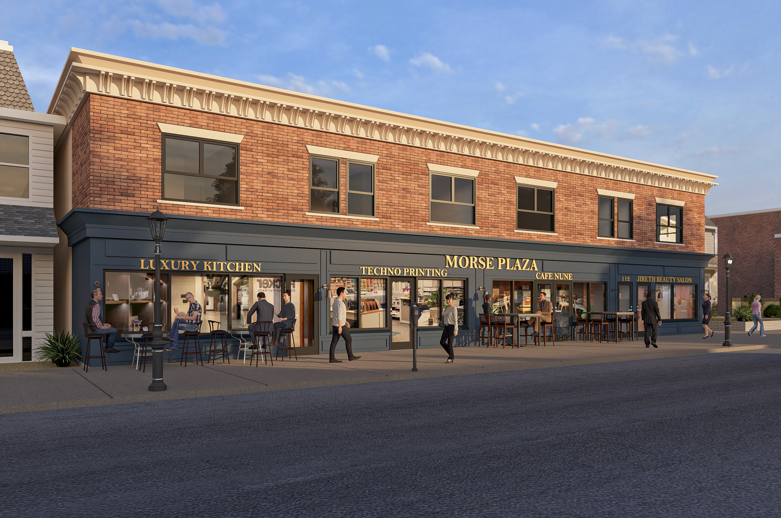 keep everything as uploaded but add a gooseneck light over each door over the signages four in total