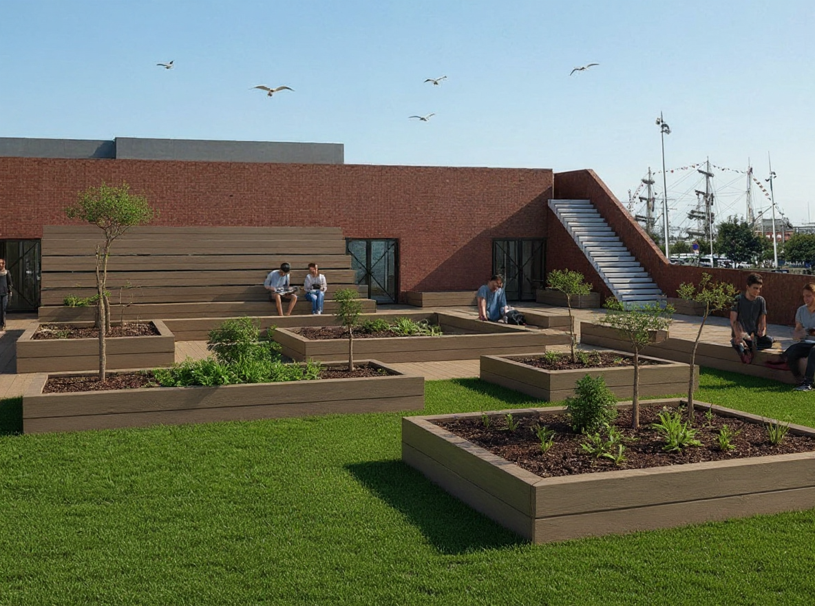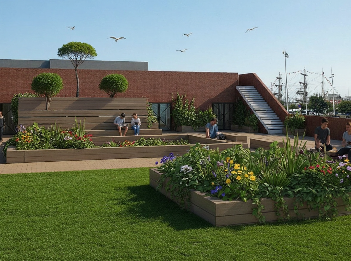 tudiants sur amphith atre arri re plus de plantes sur avant plan garde corps m tal sur escalier droite
