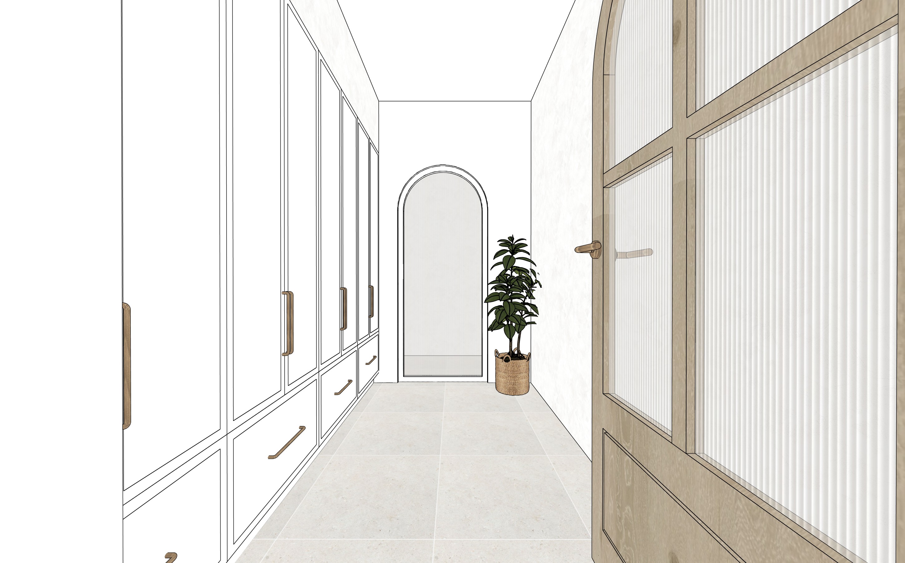 arch door way is a white steel frame with fluted glass