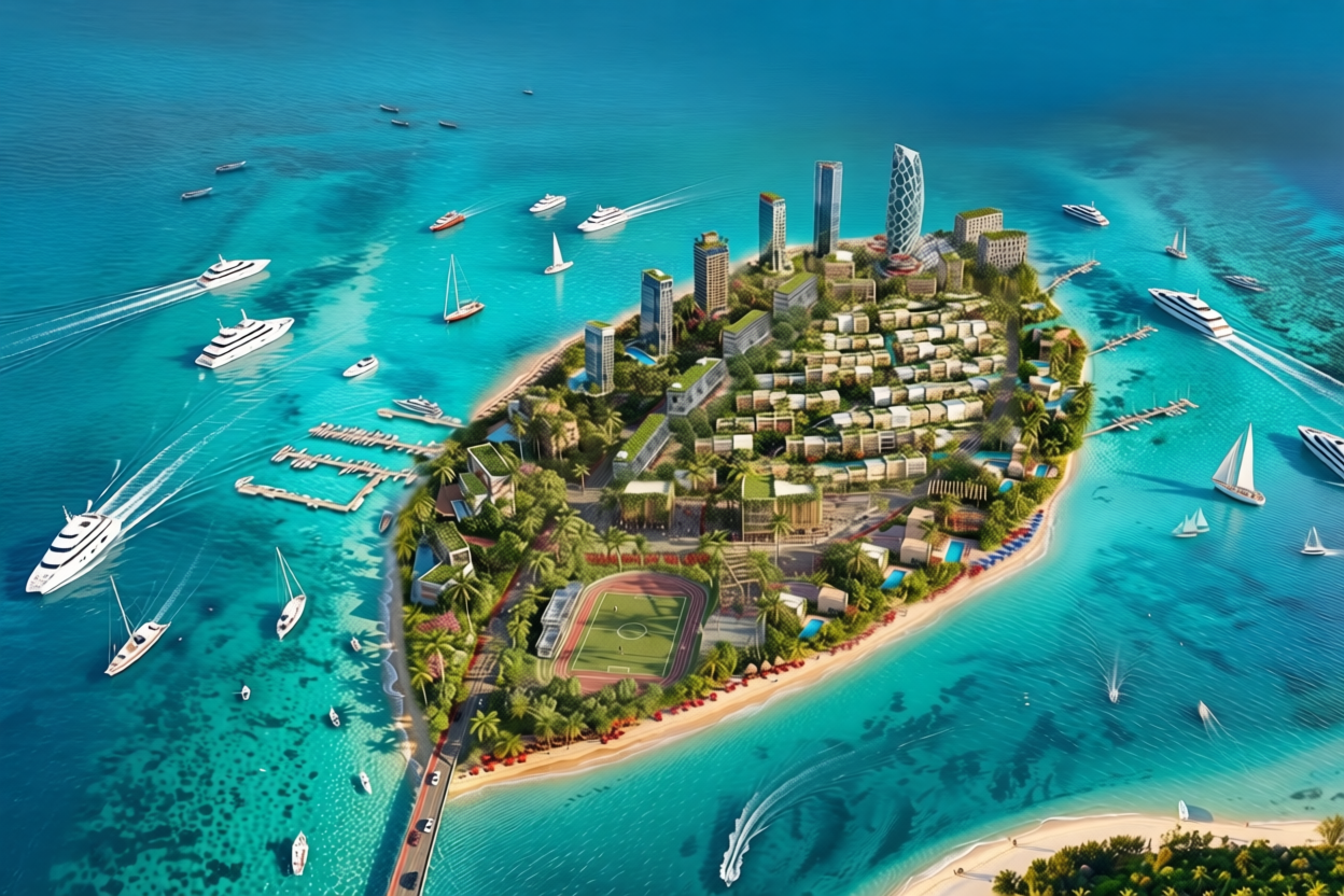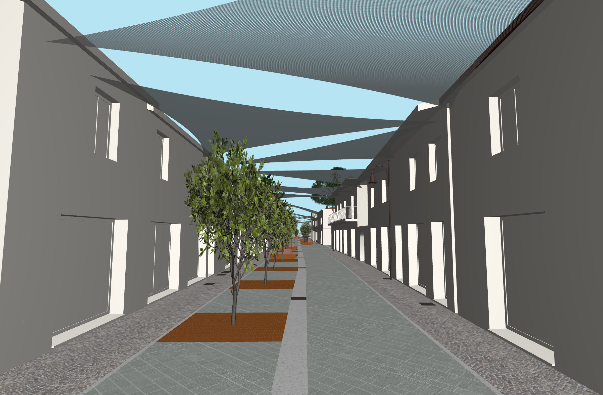 inserisci delle grandi vele ombreggianti disposte all altezza dei cornicioni dei tetti con forma a triangolo curvilineo realizzate con tele di colore ruggine traforate a disegno floreale inserisci persone che camminano e dialogano tra loro