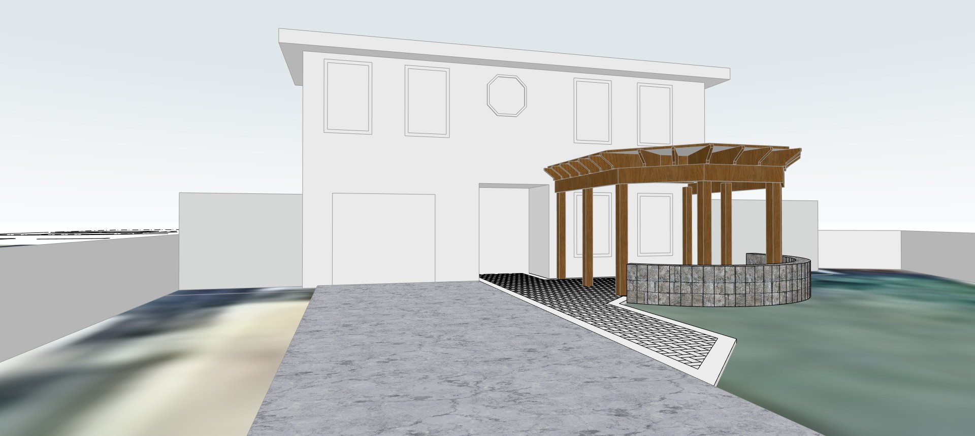 house in harlingen texas made of brick with a pergola in the front and some brick pavers on the ground also has a 2 car garage and a driveway on the left side