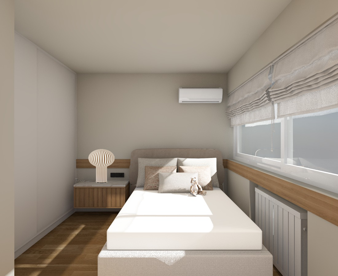 this is a children s bedroom shown in an elevation view of the bed the design is contemporary exudes comfort and conveys a sense of refined high end quality the headboard is upholstered in beige fabric creating a soft and warm focal point the bed is dressed with perfectly ironed impeccably arranged bedding and pillows styled like a five star hotel the sheets and duvet are crisp smooth and completely wrinkle free the two back pillows are in an off white tone the middle pillows are in a dusty peach while the front decorative pillow features a beige boucl fabric adding texture and depth through layered styling the bedside tables are finished in a champagne oak tone the top surface is marble with soft beige veining adding a refined material contrast all the woods textures are oak light tone the table lamp on the bedside table should remain exactly as it is the overall atmosphere is warm contemporary elegant and comfortable with a balanced and high quality aesthetic
