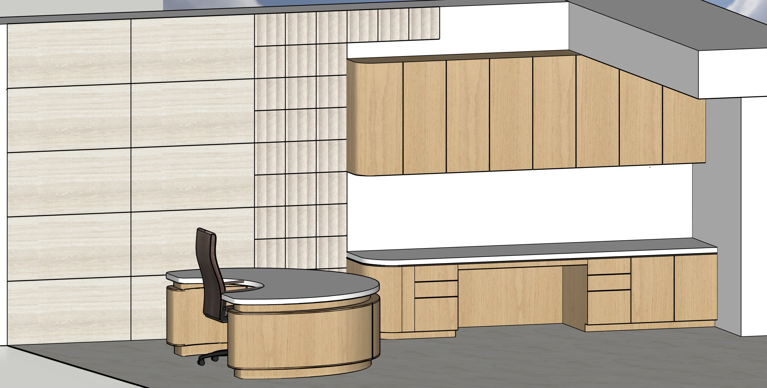 the floor is polished finish white calacatta gold marble with a subtle veining pattern the wall is ivory travertine the desk has led lights at the bottom of the wood base a light warm beige wood with brass trim details and a desktop of calacatta marble the wall cabinets are a light warm beige wood with fluted ivory travertine along the wall replace the white walls with fluted travertine tile tile seams are not visible elegant luxury interior lighting architectural photography global illumination and a soft indirect light balance the office chair is a warm beige leather all led lights are the same color 3 000 kelvin internal illumination evenly distributed d