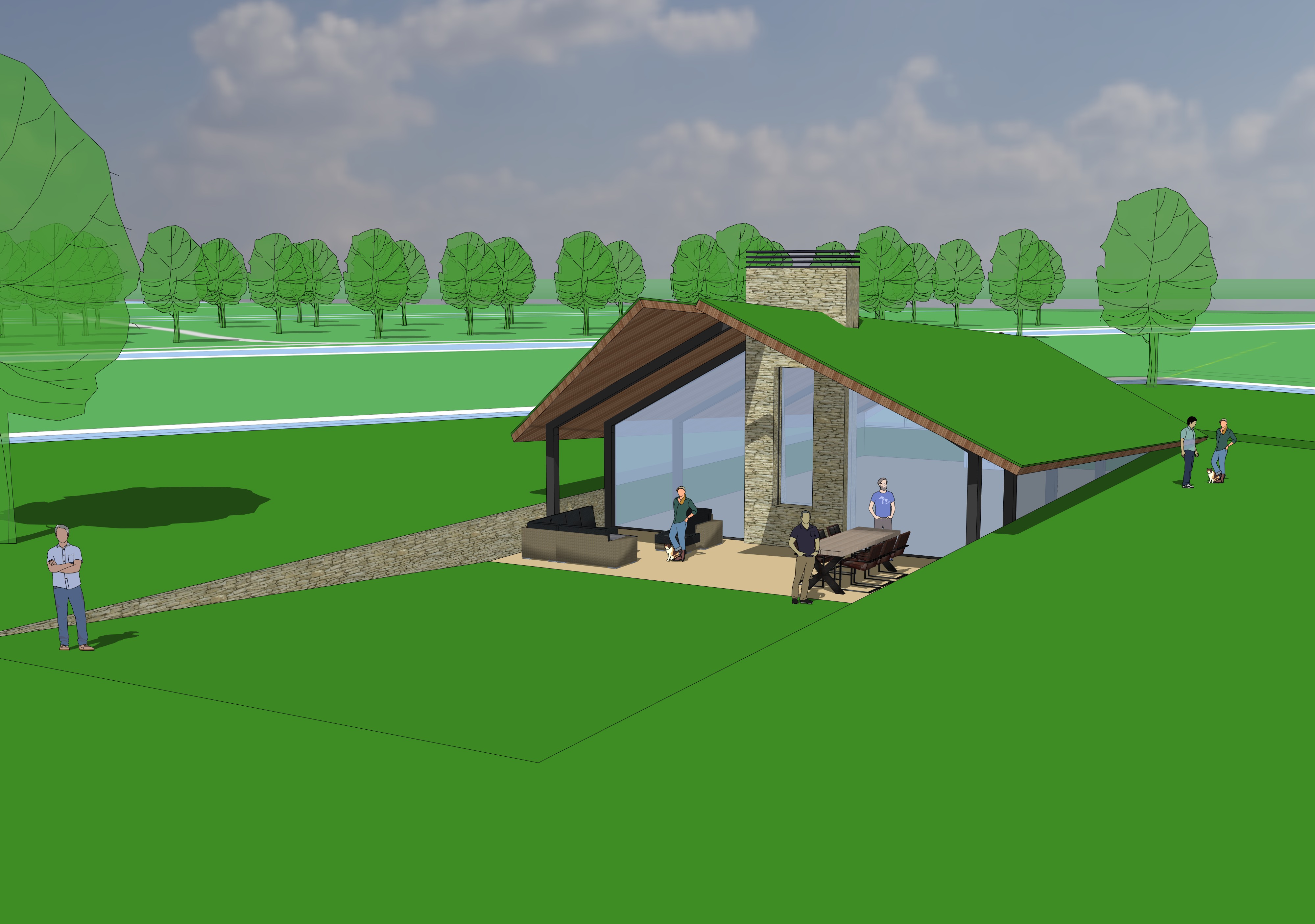 the house in the scene is surrounded by a lush green garden with lots of flowers and bushes the roof of the house is covered in grass there are lots of people in the scene the weather is sunny with a few clouds in the sky the time of day is the golden hour