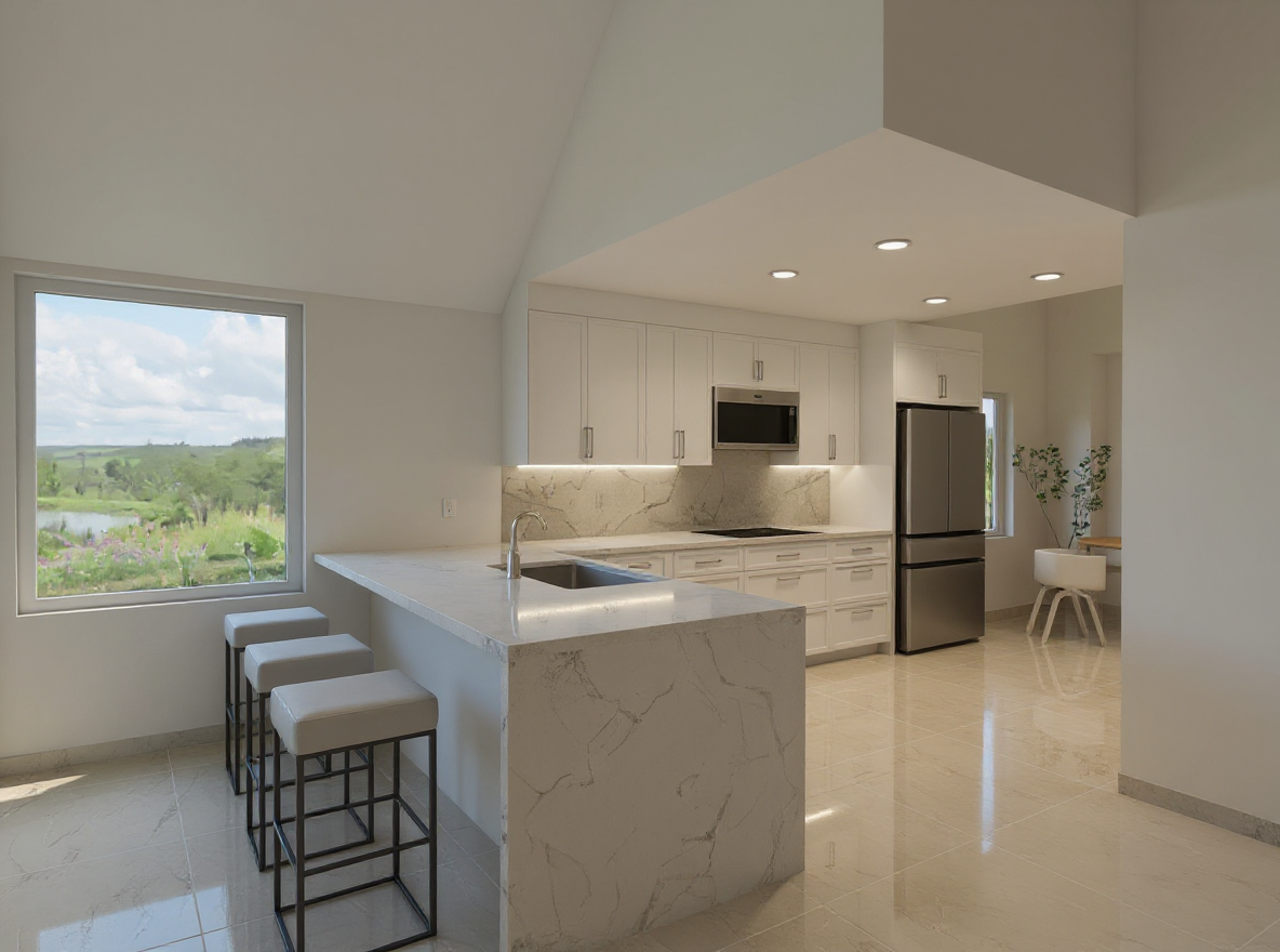 adjust the floor to a subtle improve the lighting to make the photo look more realistic make the calacatta quartz waterfall island realistic with continuous bookmatched veining but keep the veining subtle and soft reduce the intensity of the marble texture on both the countertop and backsplash so it is not too bold or heavily pronounced that s all everything else remains the same furniture included warm light beige porcelain tile 24x24 polished and slightly reflective not pure white