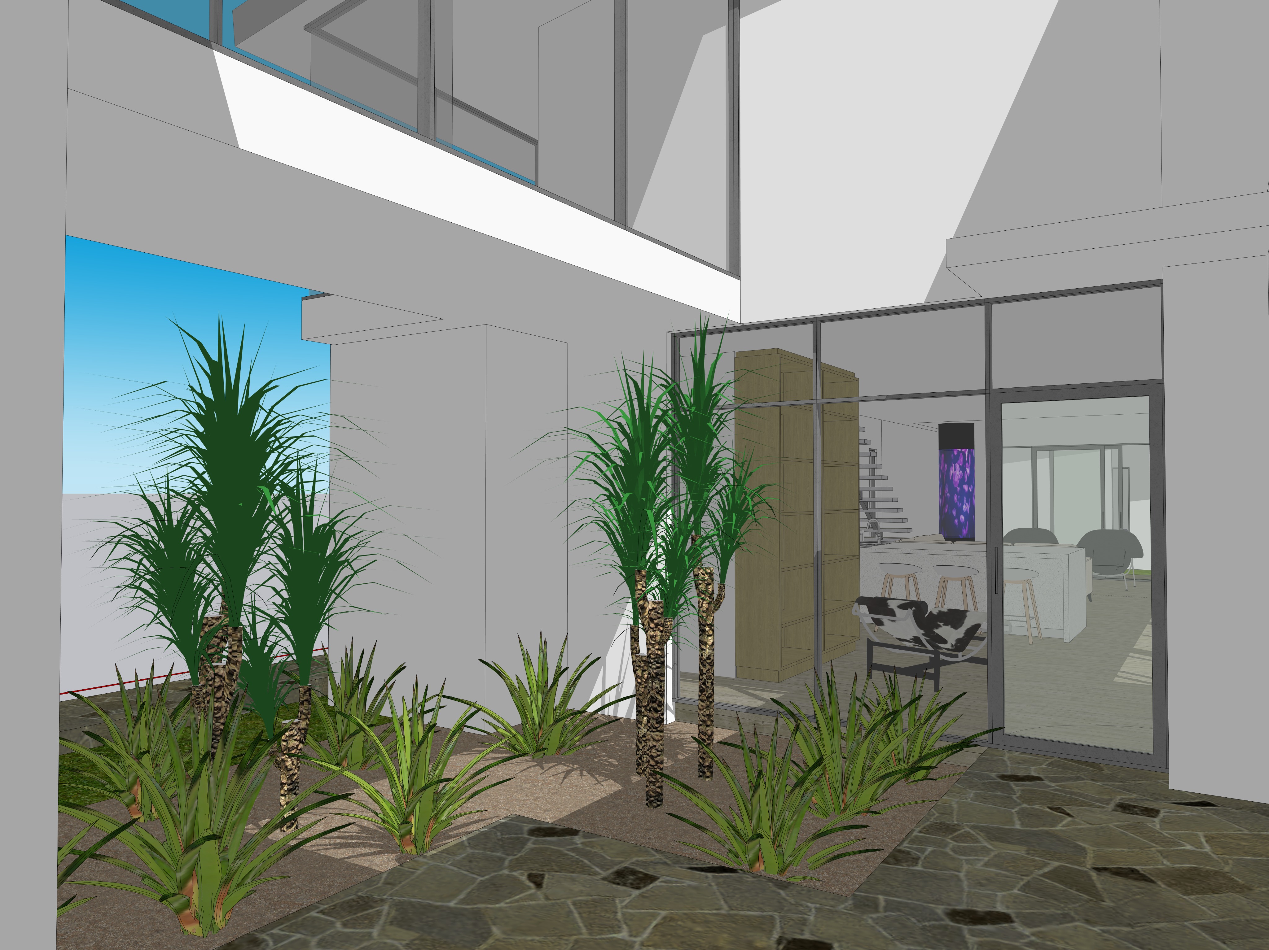 afternoon view add los angeles drought landscape around the house keep the perspective view angle from the source image add some books and objects on the bookshelves inside add a woman walking on the corridor at the second level inside at the upper left corner of the view add a man inside near the kitchen island