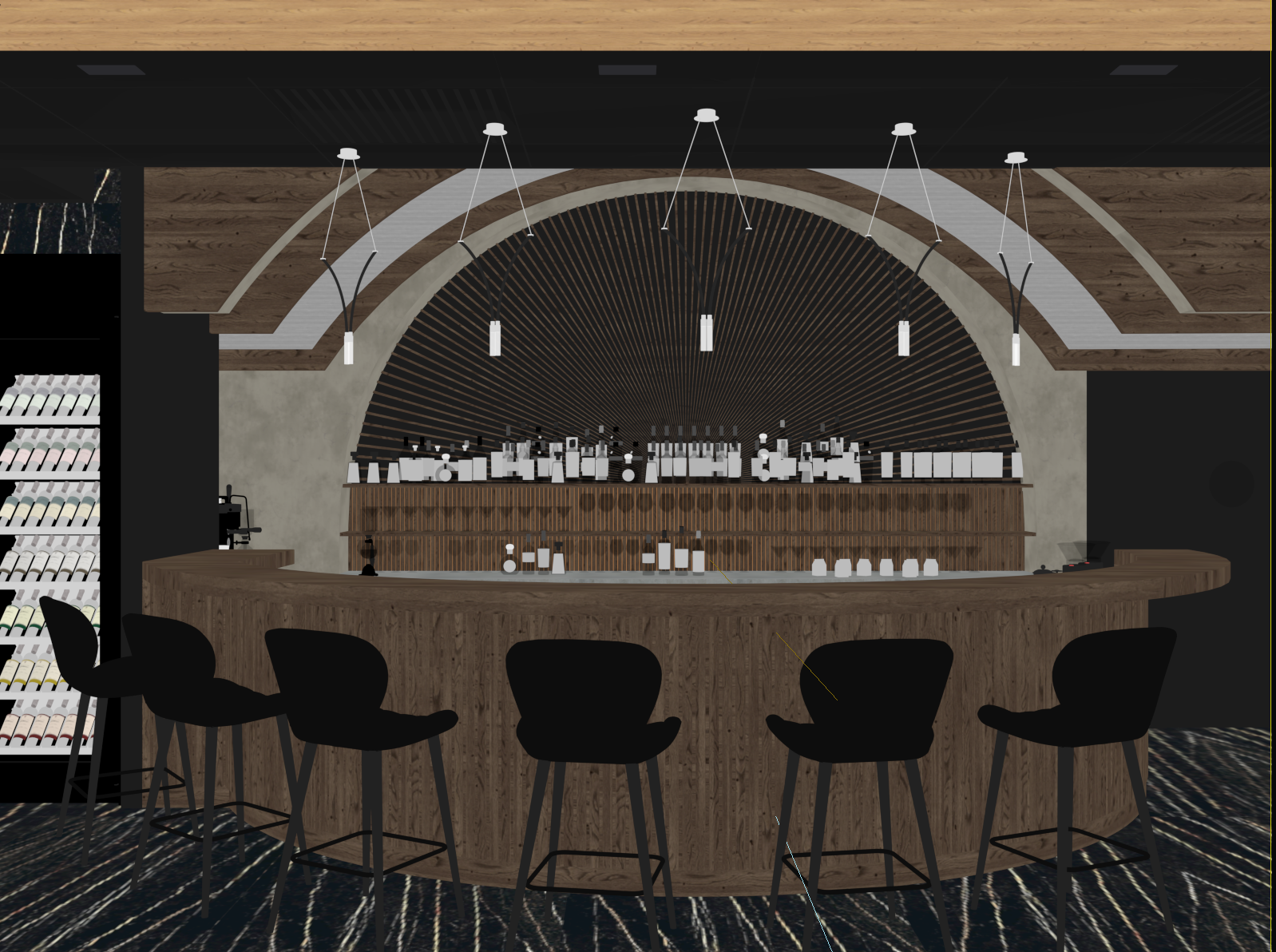 exterior shot a cozy modern bar interior with a curved wooden counter in rich mahogany sleek black bar stools with soft cushioning line the counter the back of the bar features a semi circular design with dark radial patterns creating a focal point elegant minimalist pendant lights hang from the ceiling casting a warm inviting glow the ceiling and floor are in dark textured tones adding to the intimate atmosphere bottles and glasses are arranged neatly behind the counter accentuated by soft lighting the atmosphere is sophisticated yet cozy with a color palette of deep browns blacks and warm whites